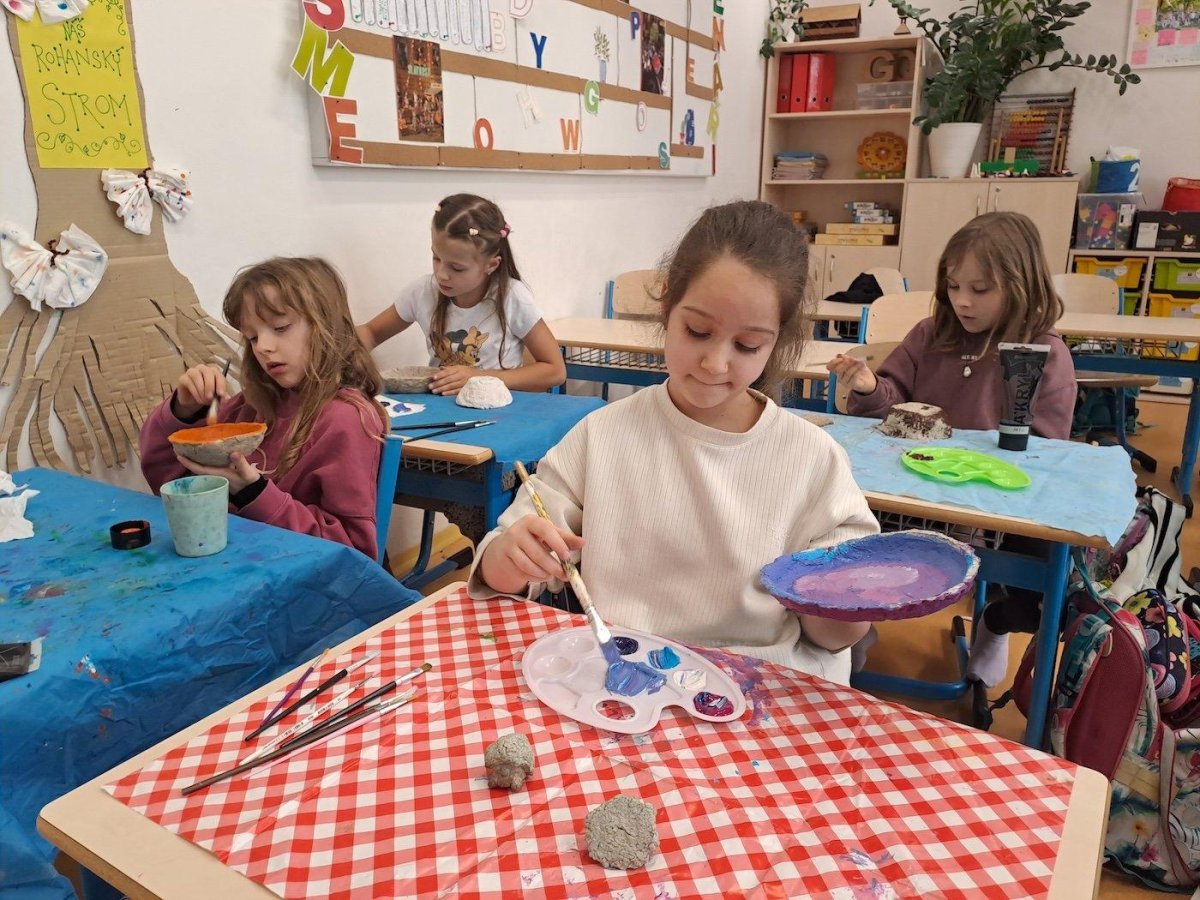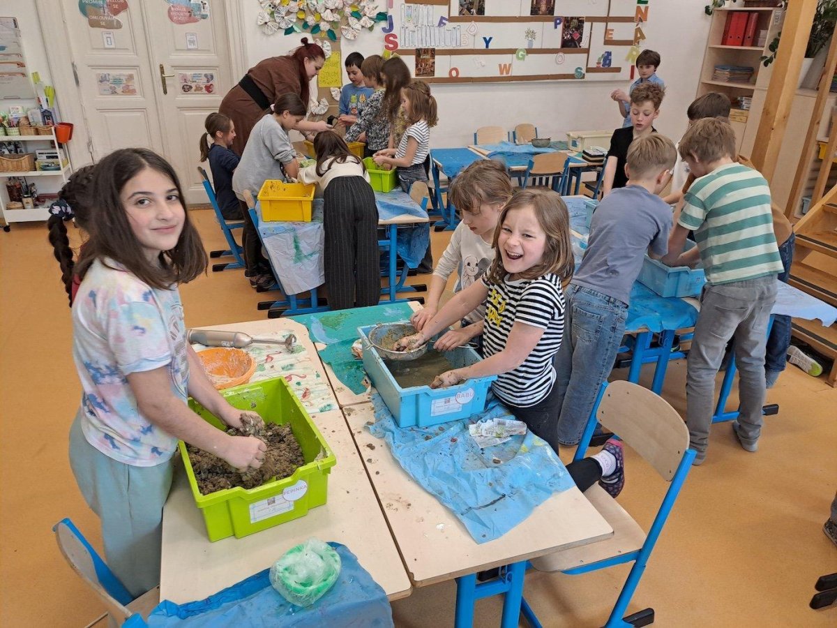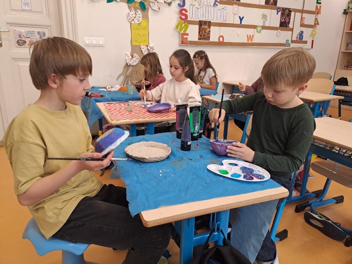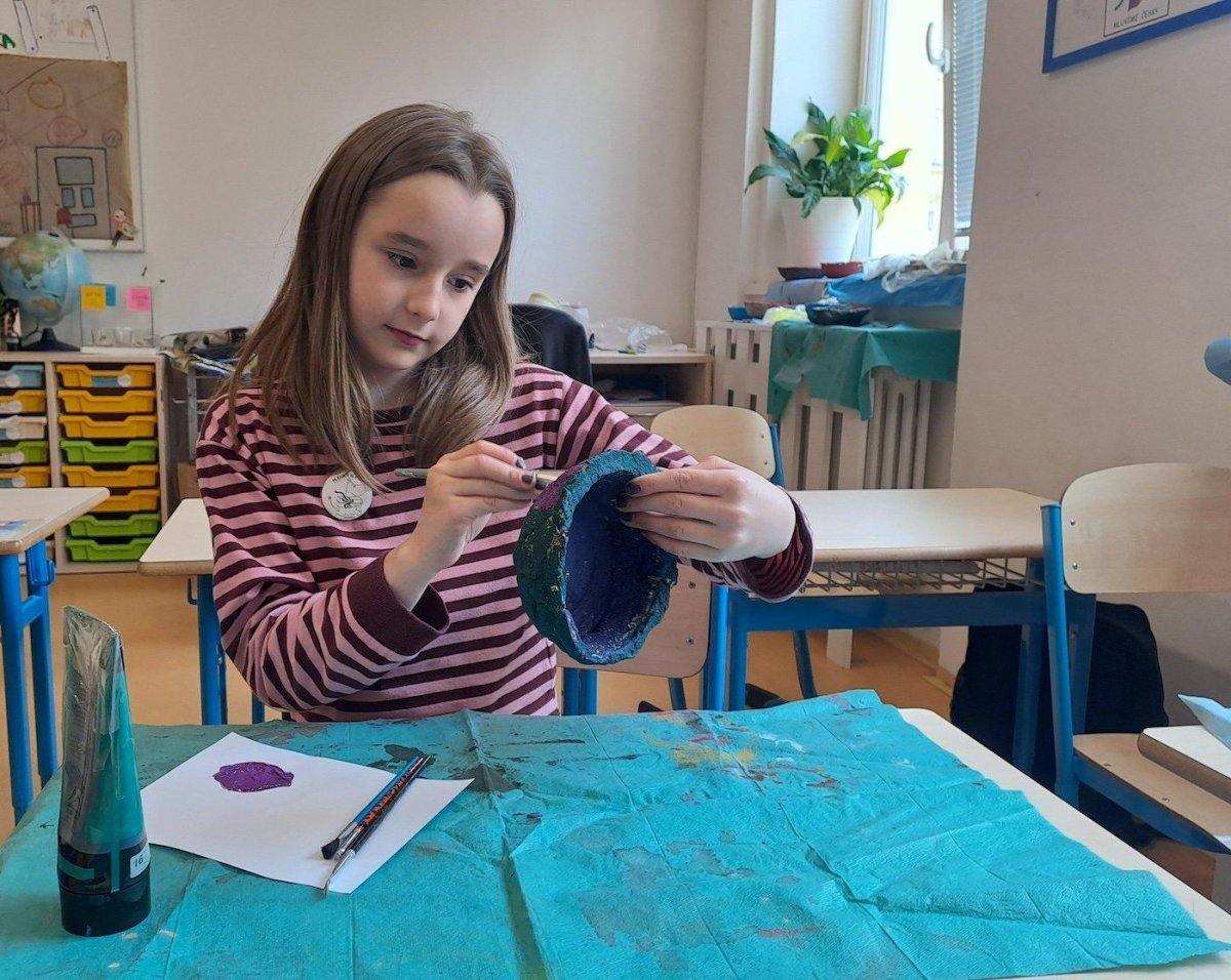 Tohle vyrábění pro nás vymyslela naše paní učitelka Alena Wernerová, kterou máme moc rádi a která má vždycky nějaký zajímavý nápad. Pokud byste chtěli vidět, co všechno se dá vykouzlit z papíru, vody, mouky a trochy fantazie, zastavte se 31. března 2026 na Lyčkově náměstí od 15:00 – 17:00 hod. Budeme tam naše misky prodávat!