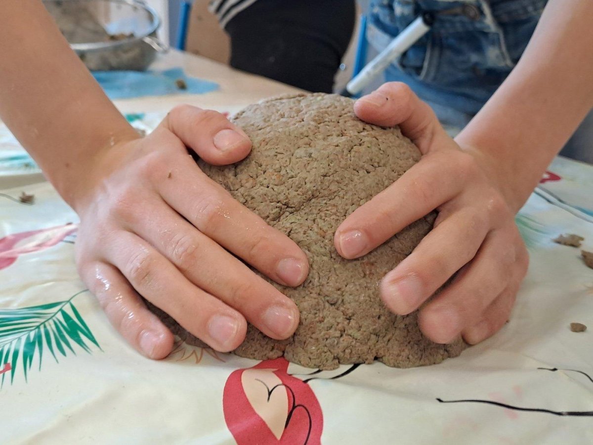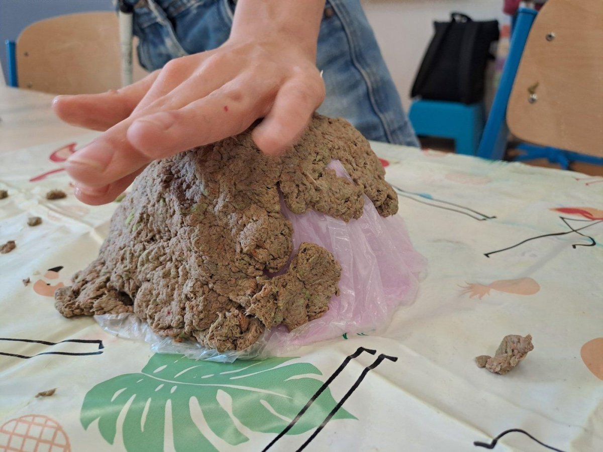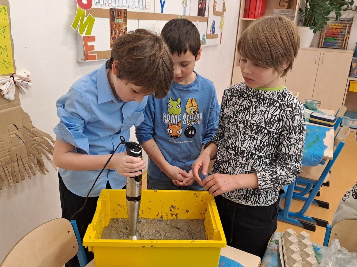 Nejdřív jsme rozmočili kartony od vajíček a pak je rozmixovali. Vypadalo to přesně jako mleté maso na sekanou, ale jíst by to určitě nikdo nechtěl. Pak jsme hmotu pořádně vyždímali a vyrobili si domácí lepidlo z mouky a vody, které pro změnu připomínalo bramborovou kaši.