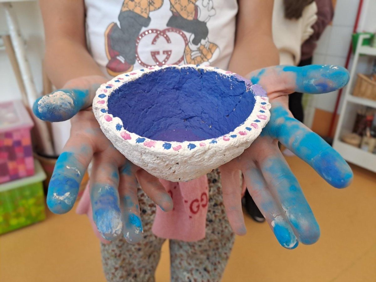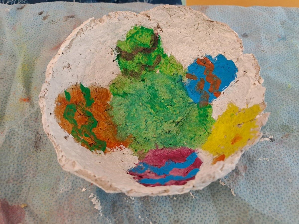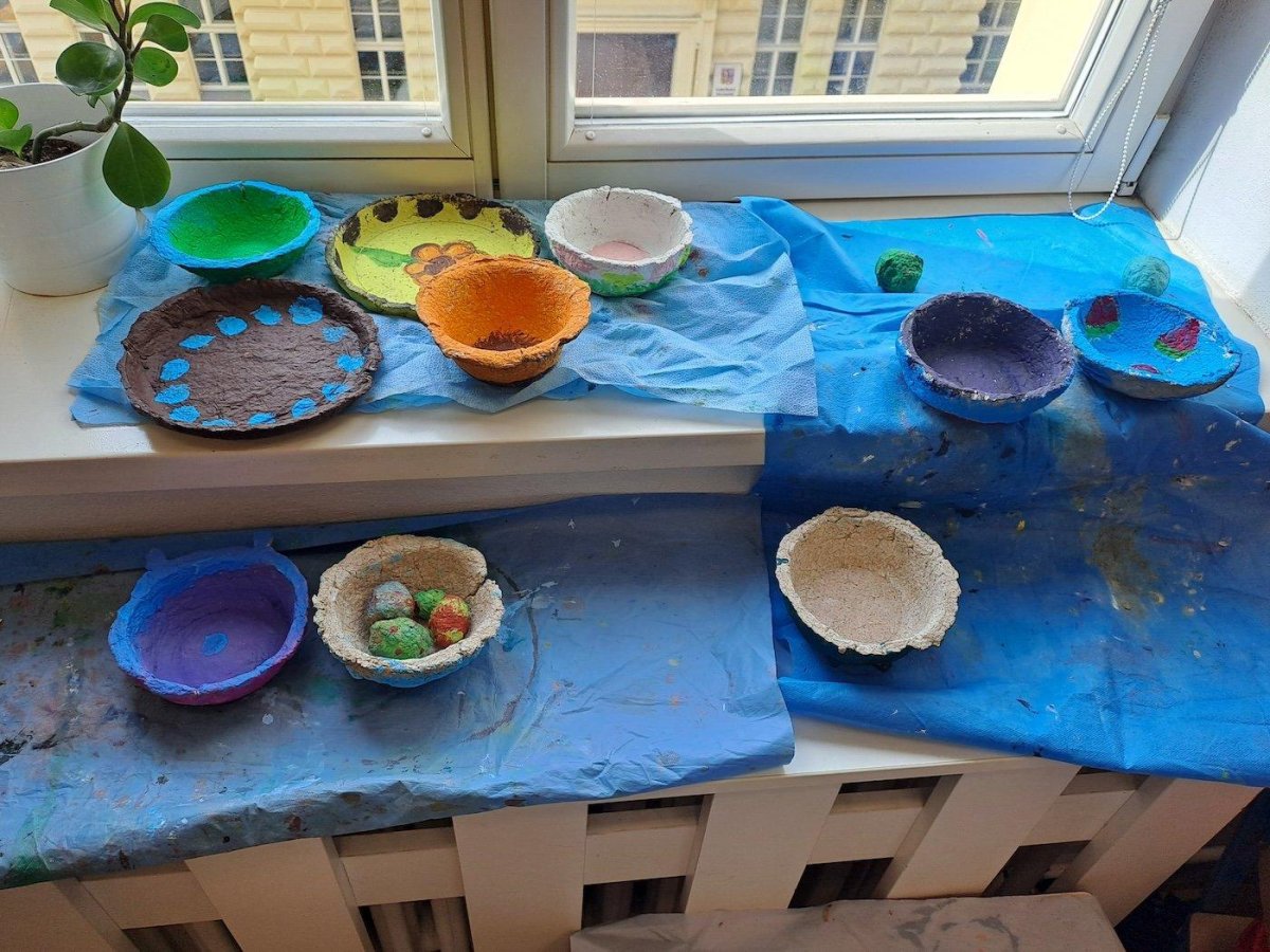 Obojí jsme smíchali dohromady a z téhle hmoty jsme vyráběli naše misky a taky kuličky a koule. Nejvíc nás bavila práce s lepidlem, i když jsme od něj po skončení byli všichni ulepení až za ušima. Nejdřív jsme si pro misky připravili formu, obalili ji igelitem a pak na ni nanášeli vrstvu směsi. Když všechno za pár dní uschlo a ztvrdlo, nabarvili jsme výrobky akrylovými barvami. Každý kus je originál.