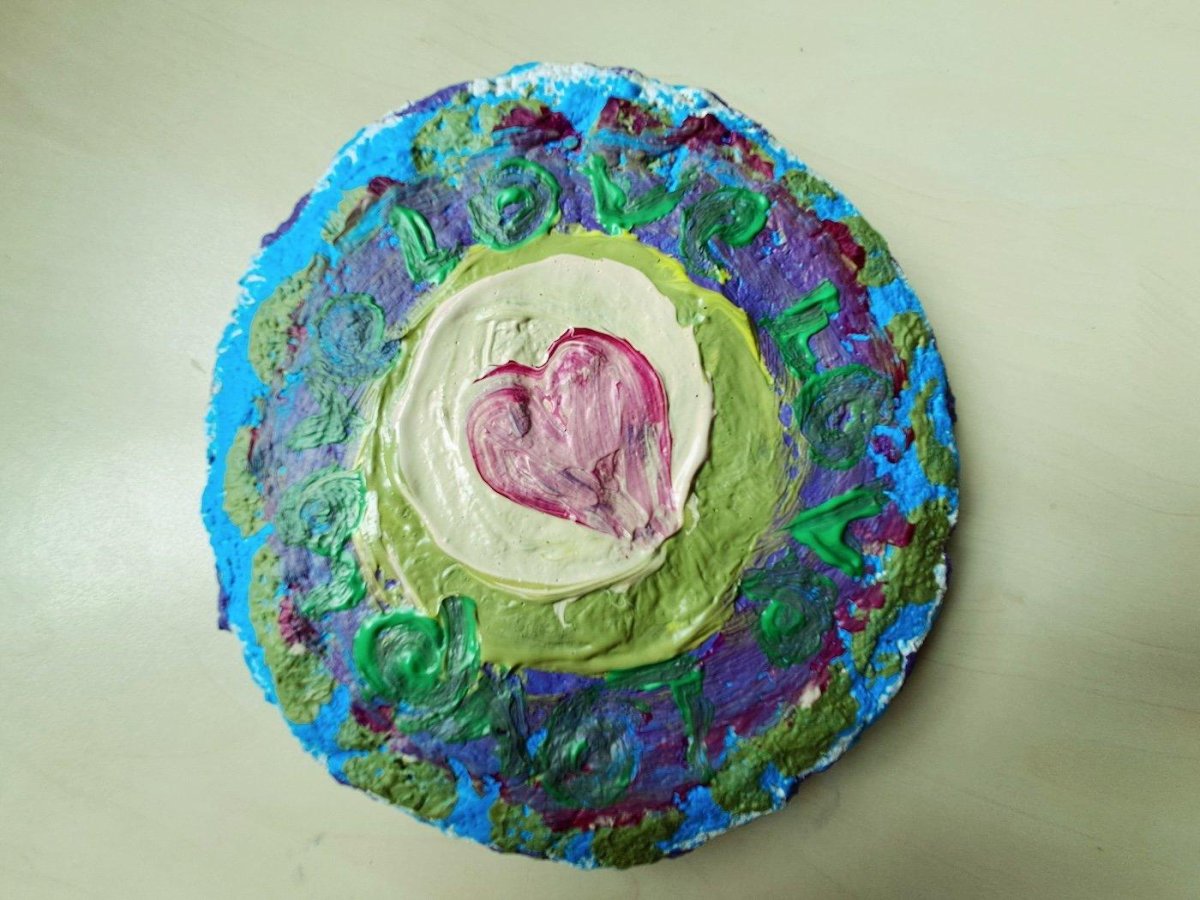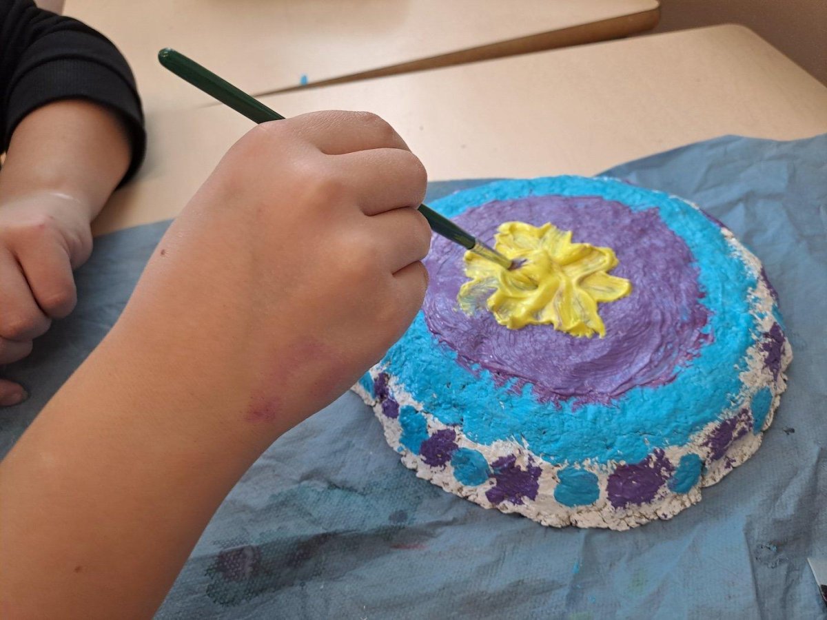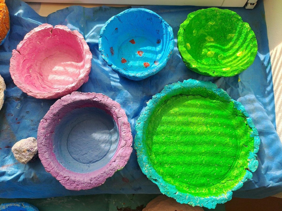 Obojí jsme smíchali dohromady a z téhle hmoty jsme vyráběli naše misky a taky kuličky a koule. Nejvíc nás bavila práce s lepidlem, i když jsme od něj po skončení byli všichni ulepení až za ušima. Nejdřív jsme si pro misky připravili formu, obalili ji igelitem a pak na ni nanášeli vrstvu směsi. Když všechno za pár dní uschlo a ztvrdlo, nabarvili jsme výrobky akrylovými barvami. Každý kus je originál.