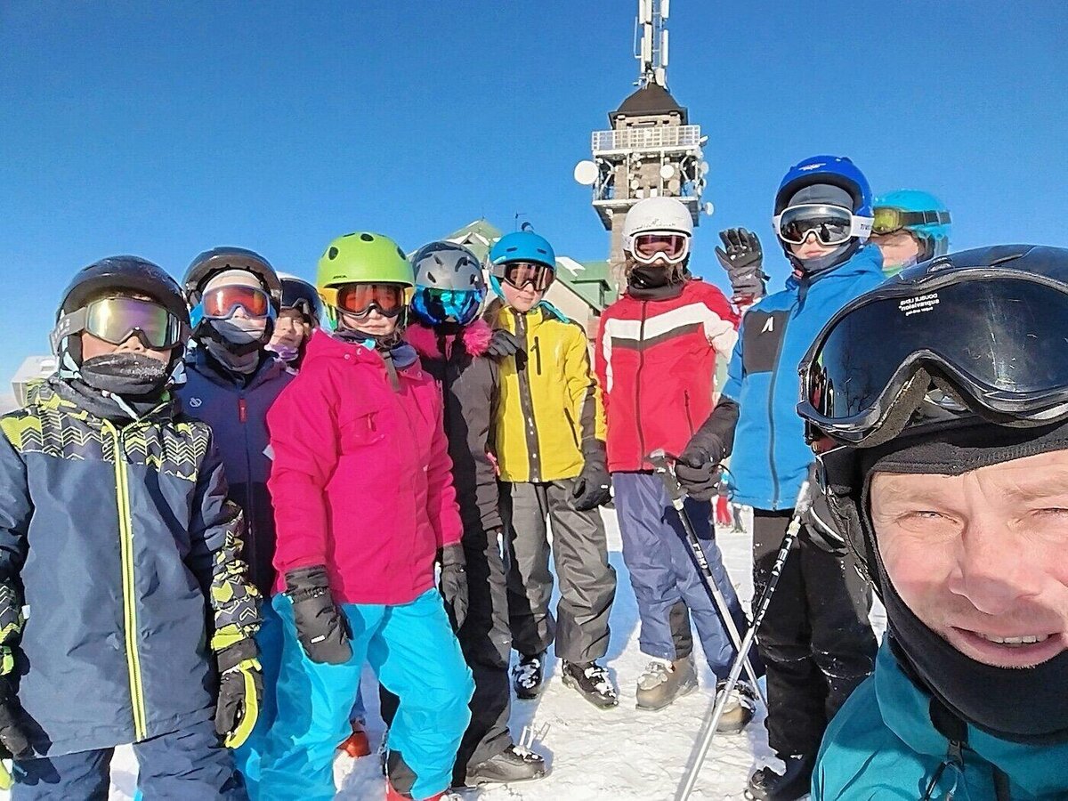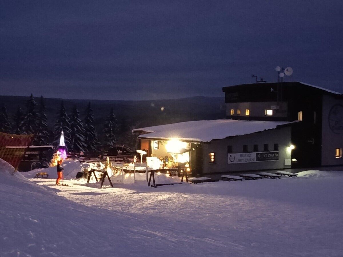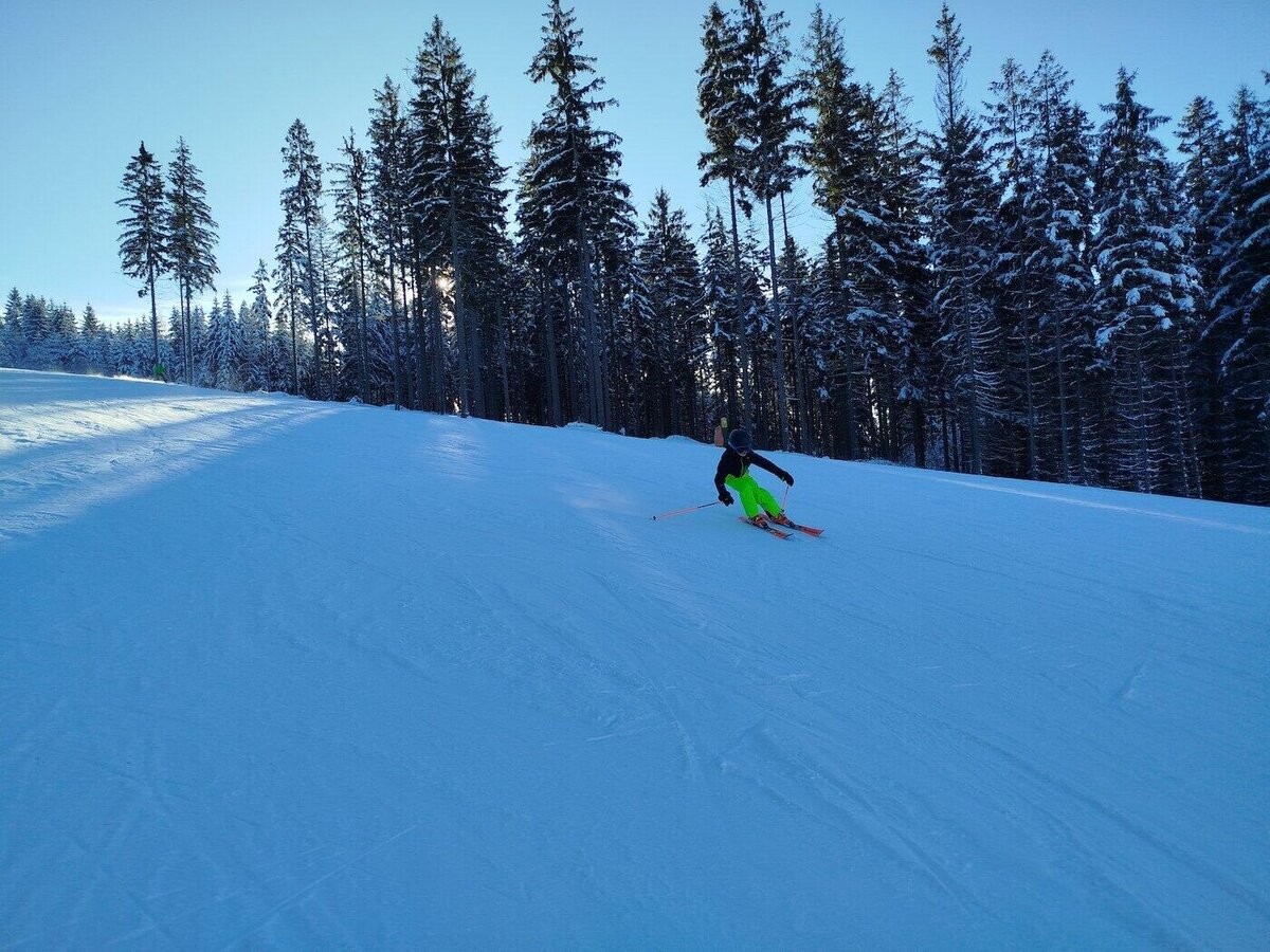 Odpoledne jsme na vrcholku Tanvaldského špičáku již jen my a rolbaři upravující svahy, takže máme možnost v klidu vyzkoušet naše vybavení a sjet první kopeček, abychom se trochu rozřadili do čtyř družstev, ve kterých budeme následující dny řádit na zasněžených stráních.