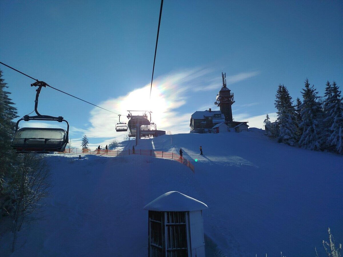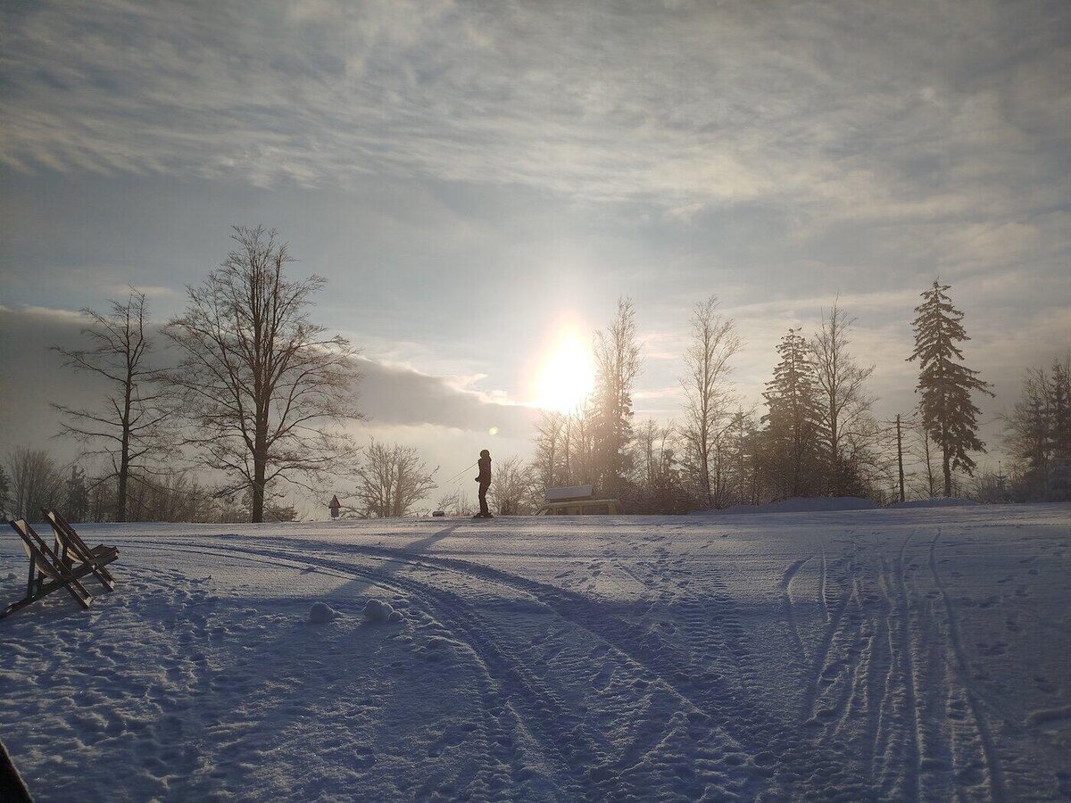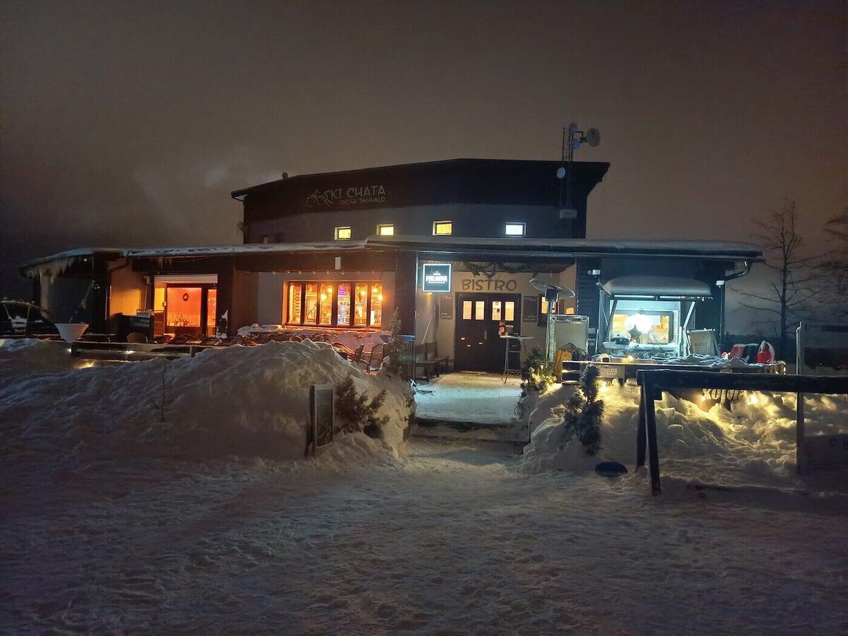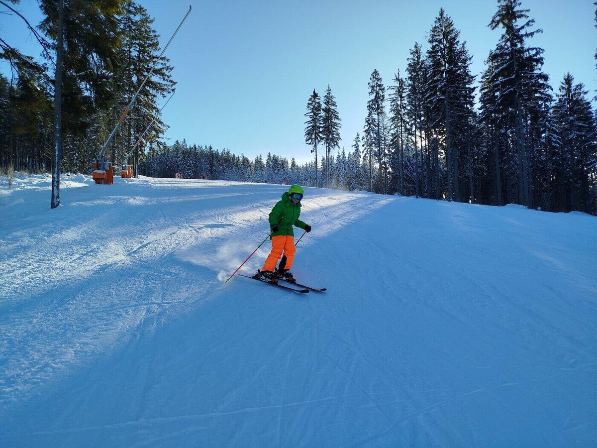 Odpoledne jsme na vrcholku Tanvaldského špičáku již jen my a rolbaři upravující svahy, takže máme možnost v klidu vyzkoušet naše vybavení a sjet první kopeček, abychom se trochu rozřadili do čtyř družstev, ve kterých budeme následující dny řádit na zasněžených stráních.