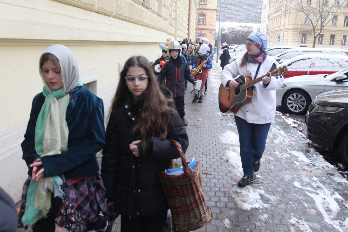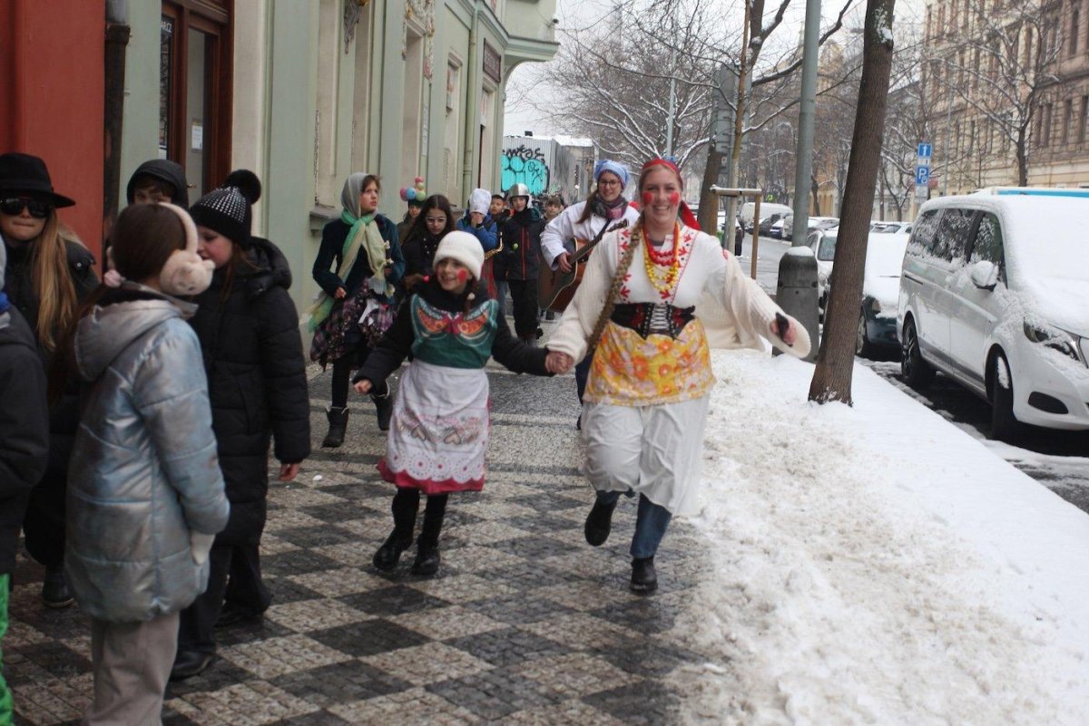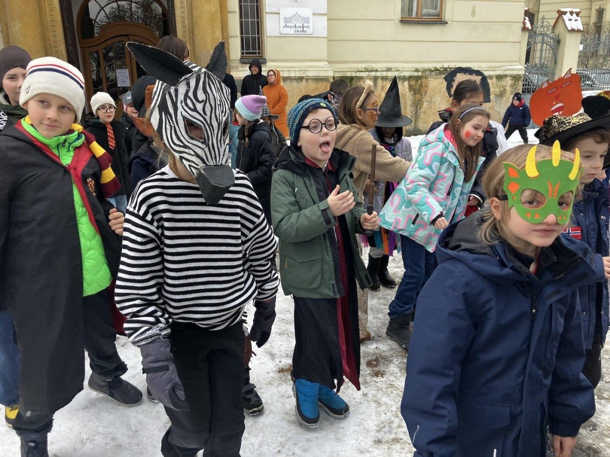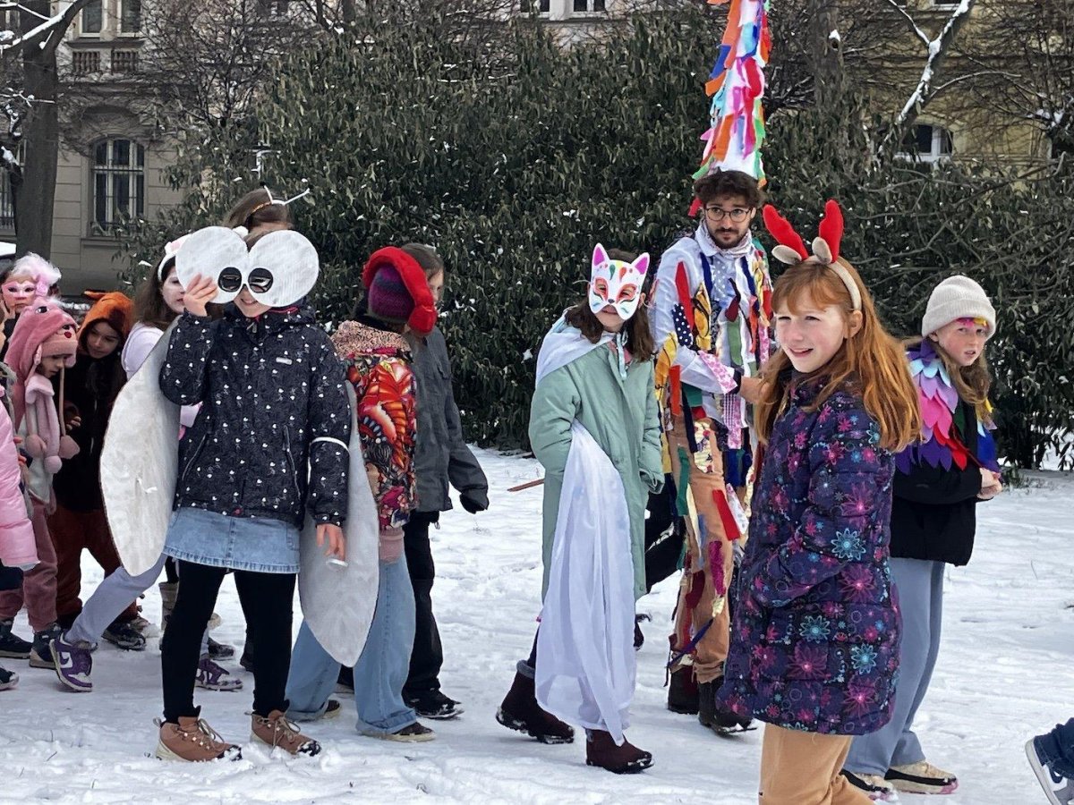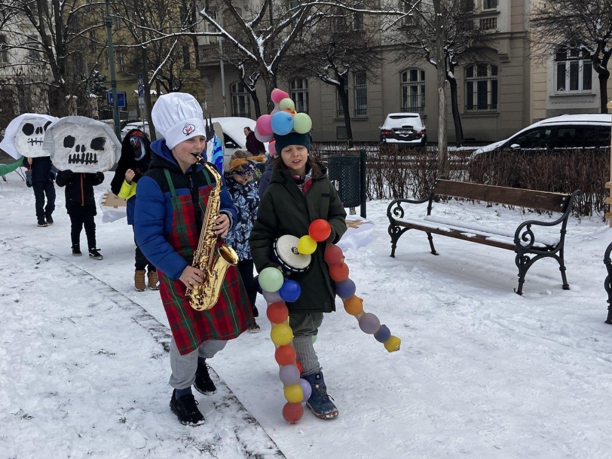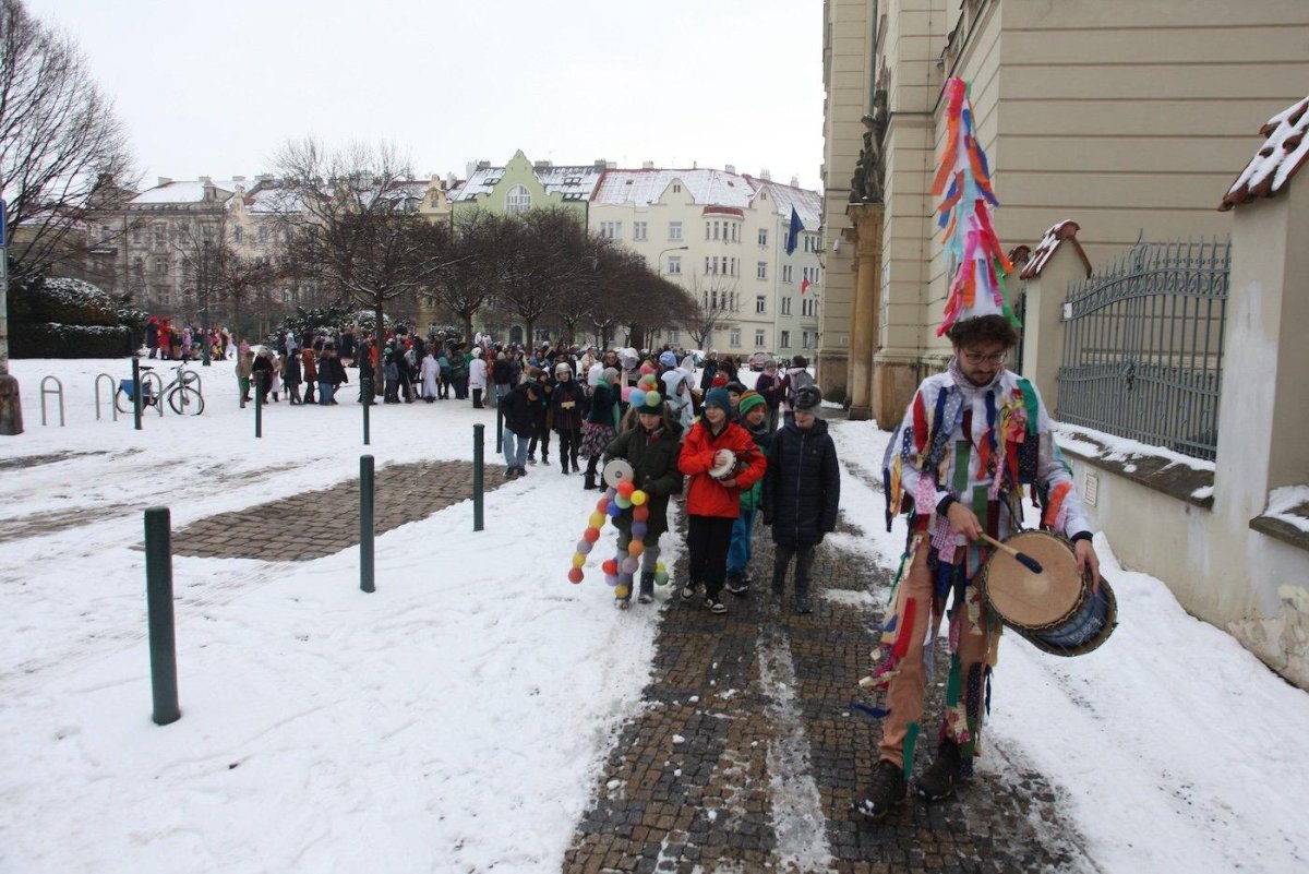 Pestrobarevný průvod masek vyrazil od budovy naší „Pernerky“ a doprovázen muzikanty probarvil zasněžené bílé ulice až k hlavní školní budově na Lyčkově náměstí. Radost byla nakažlivá – obyvatelé Karlína nám s úsměvem mávali a někteří se k veselému reji na chvíli i přidali.