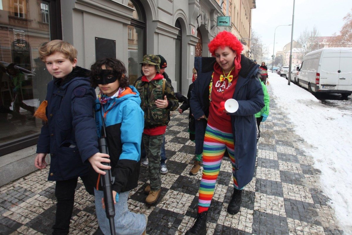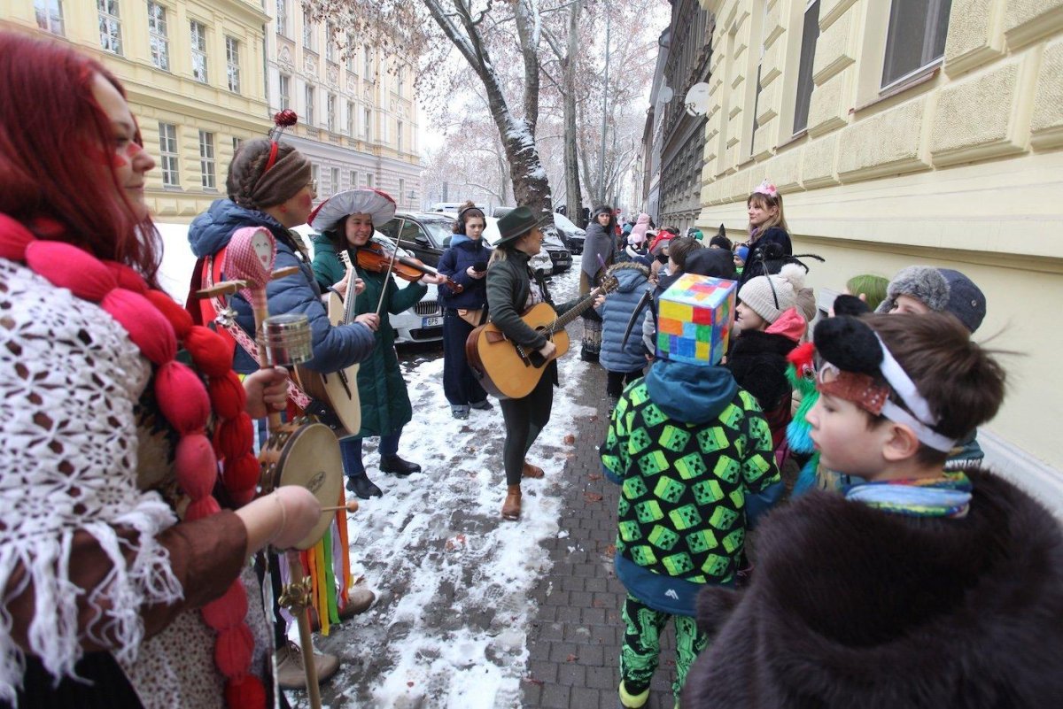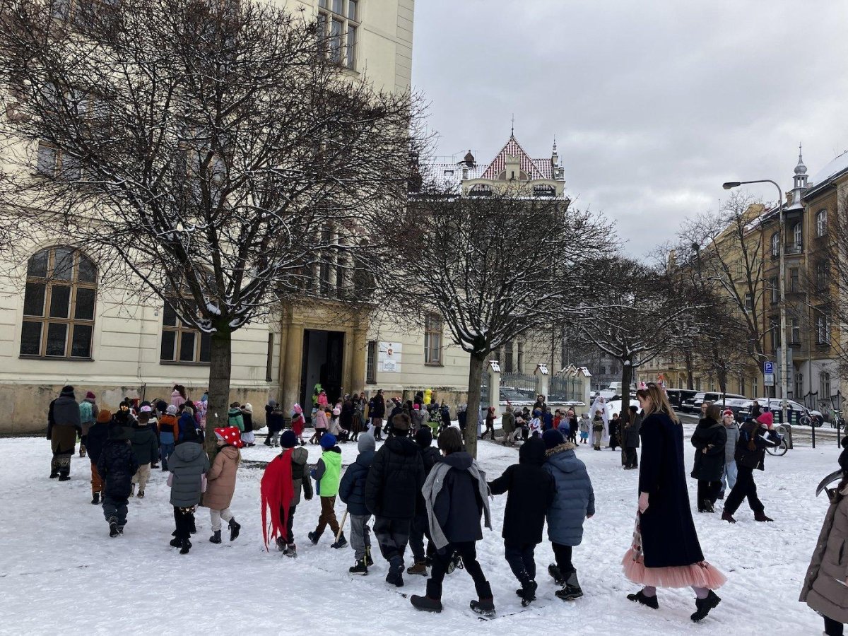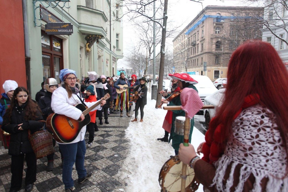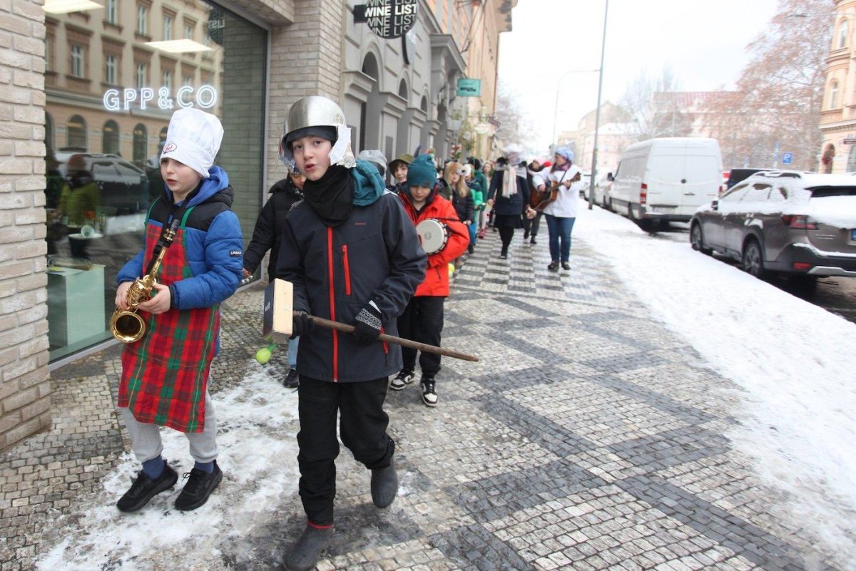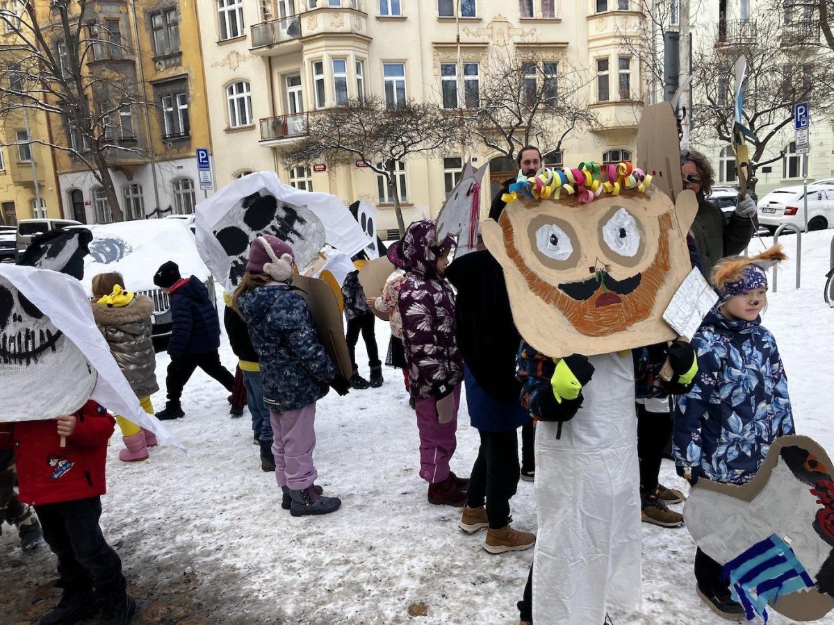 Pestrobarevný průvod masek vyrazil od budovy naší „Pernerky“ a doprovázen muzikanty probarvil zasněžené bílé ulice až k hlavní školní budově na Lyčkově náměstí. Radost byla nakažlivá – obyvatelé Karlína nám s úsměvem mávali a někteří se k veselému reji na chvíli i přidali.