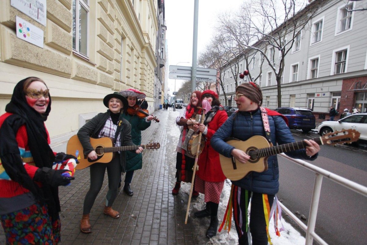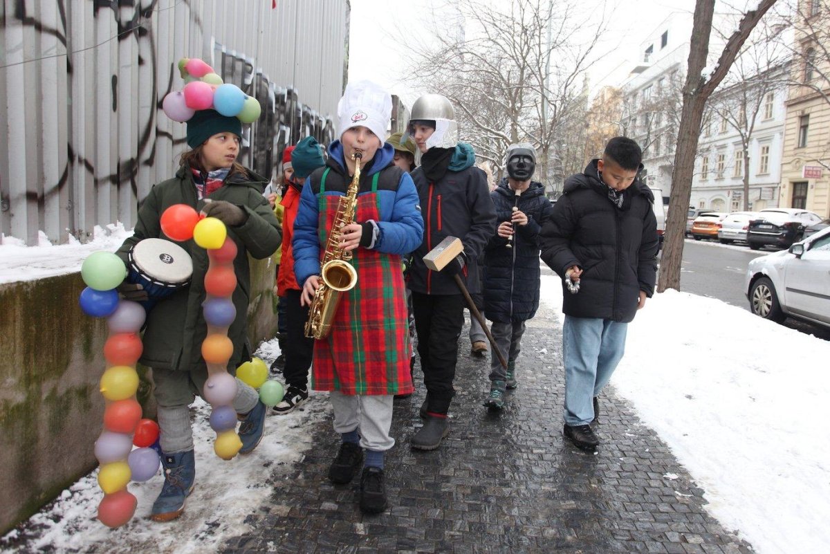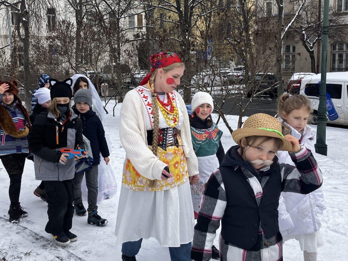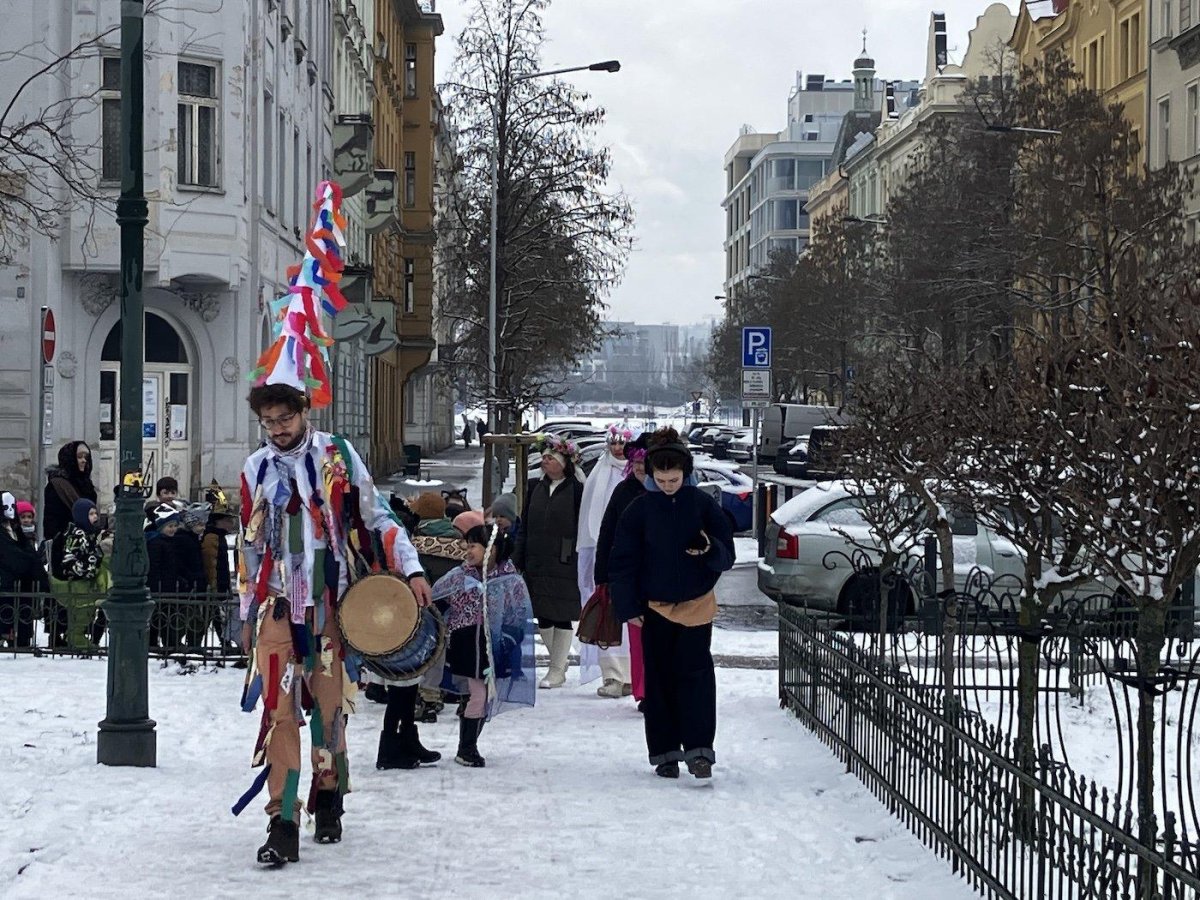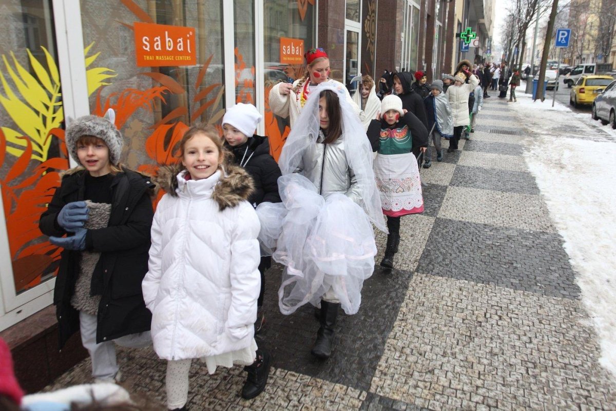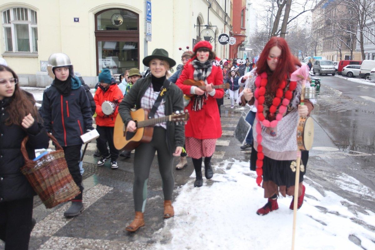 Pestrobarevný průvod masek vyrazil od budovy naší „Pernerky“ a doprovázen muzikanty probarvil zasněžené bílé ulice až k hlavní školní budově na Lyčkově náměstí. Radost byla nakažlivá – obyvatelé Karlína nám s úsměvem mávali a někteří se k veselému reji na chvíli i přidali.