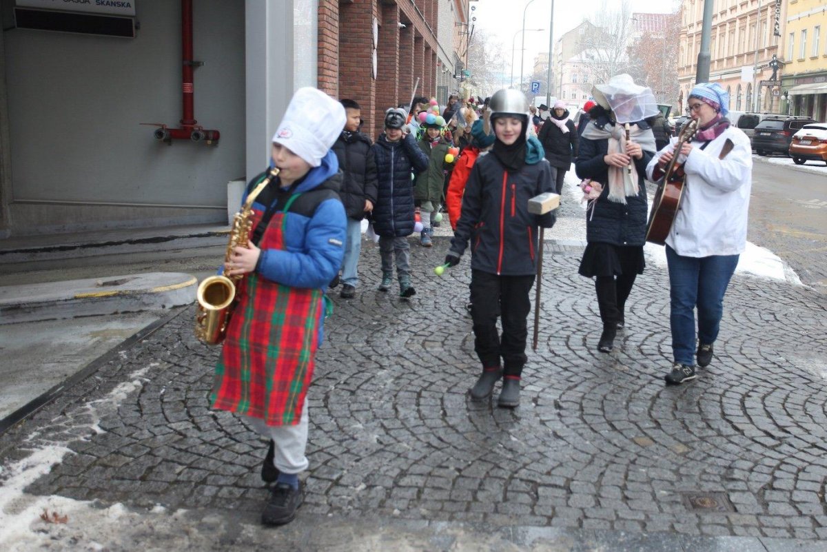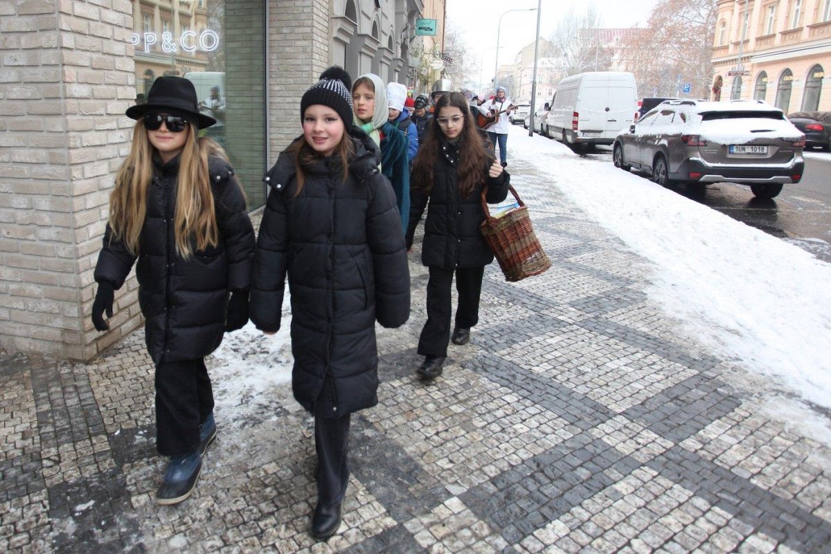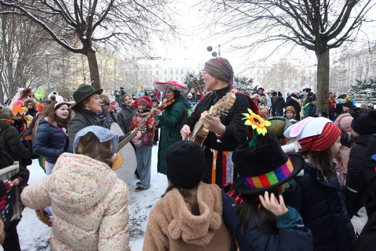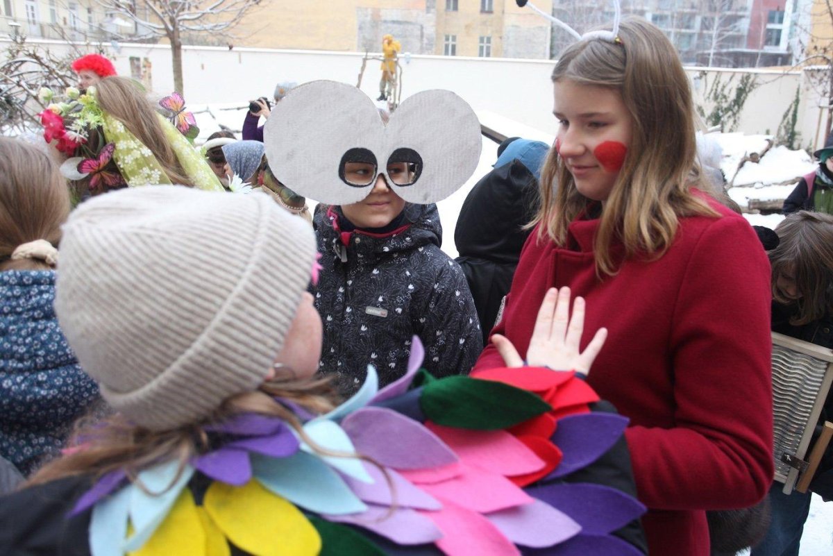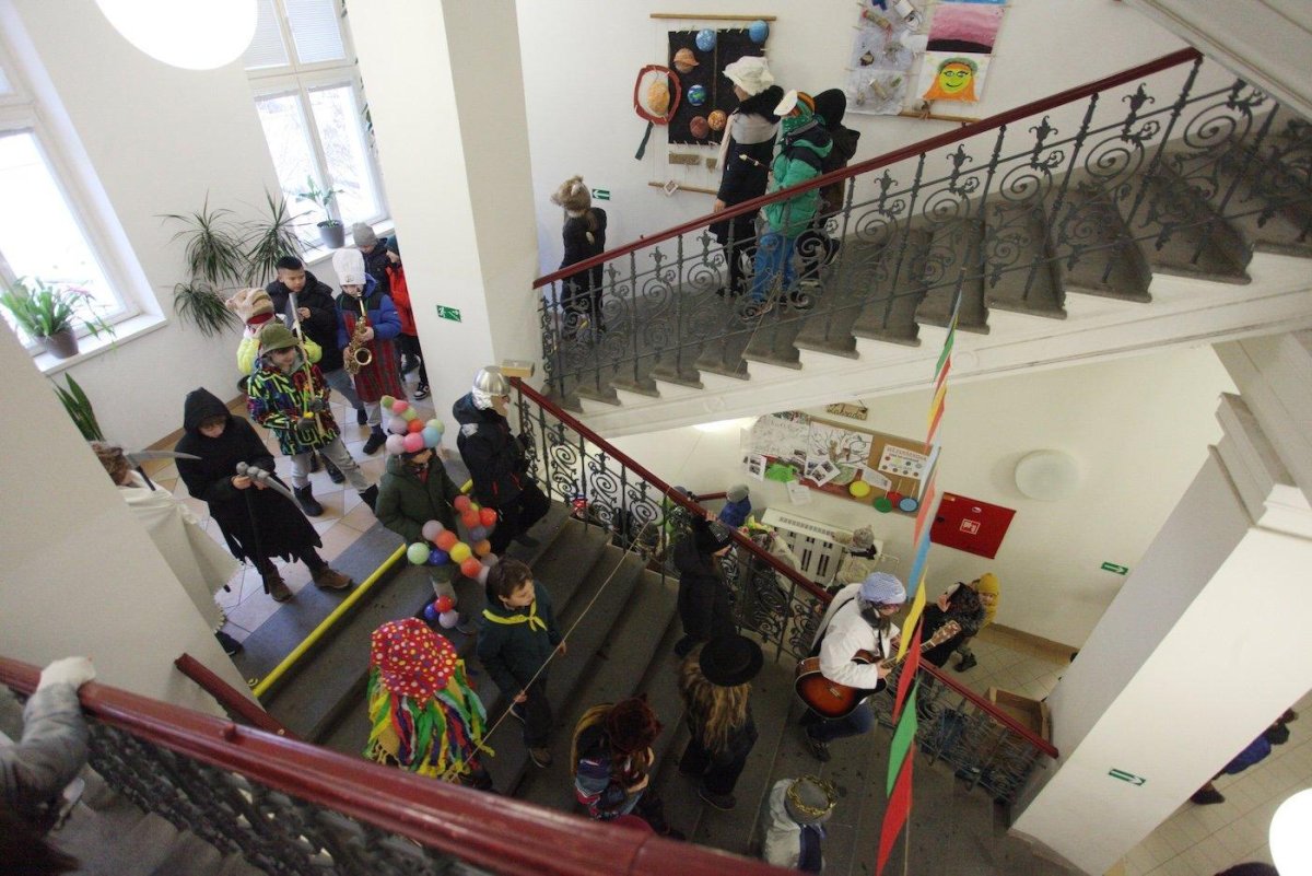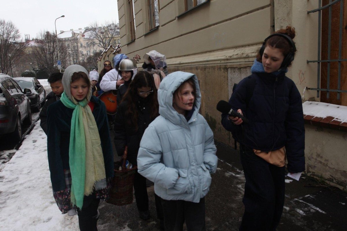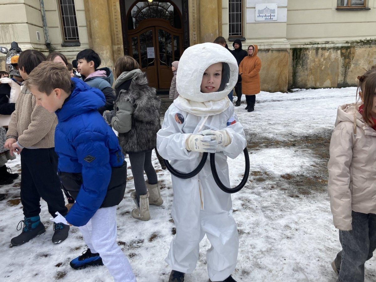 Pestrobarevný průvod masek vyrazil od budovy naší „Pernerky“ a doprovázen muzikanty probarvil zasněžené bílé ulice až k hlavní školní budově na Lyčkově náměstí. Radost byla nakažlivá – obyvatelé Karlína nám s úsměvem mávali a někteří se k veselému reji na chvíli i přidali.