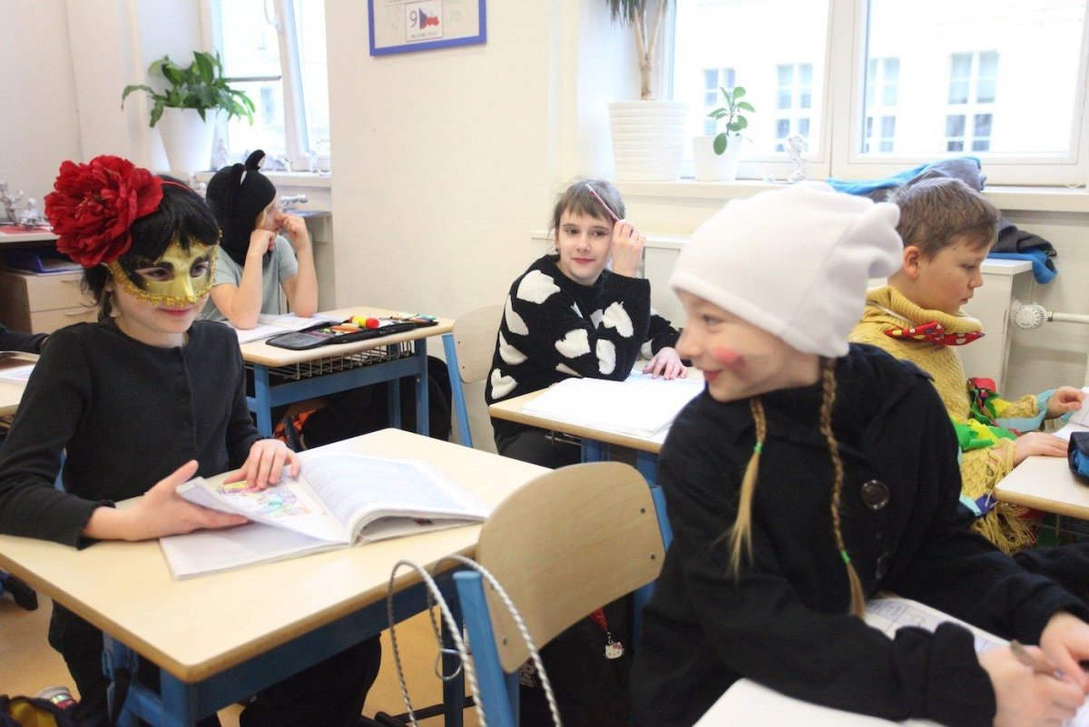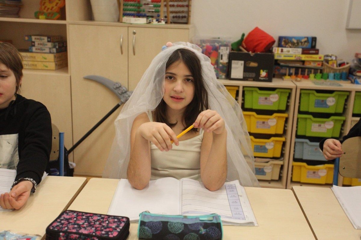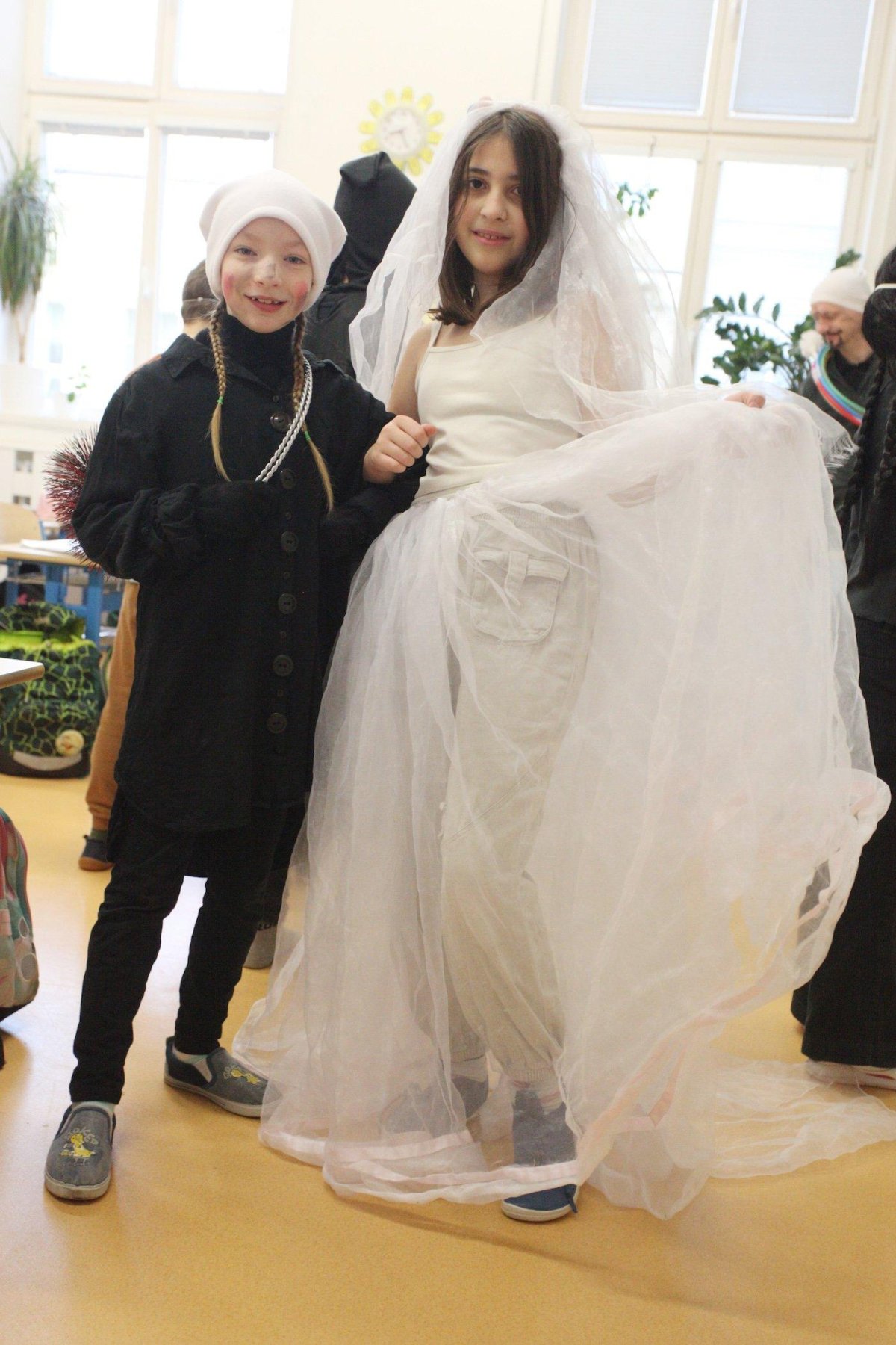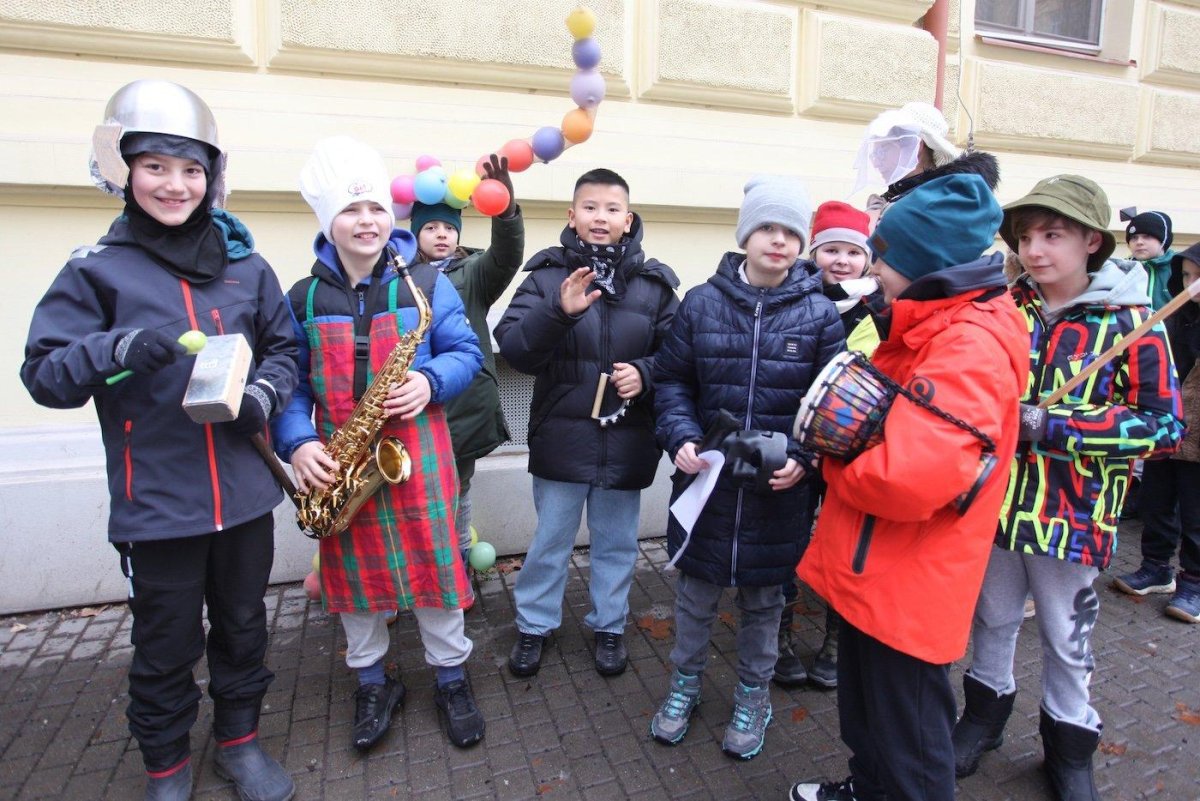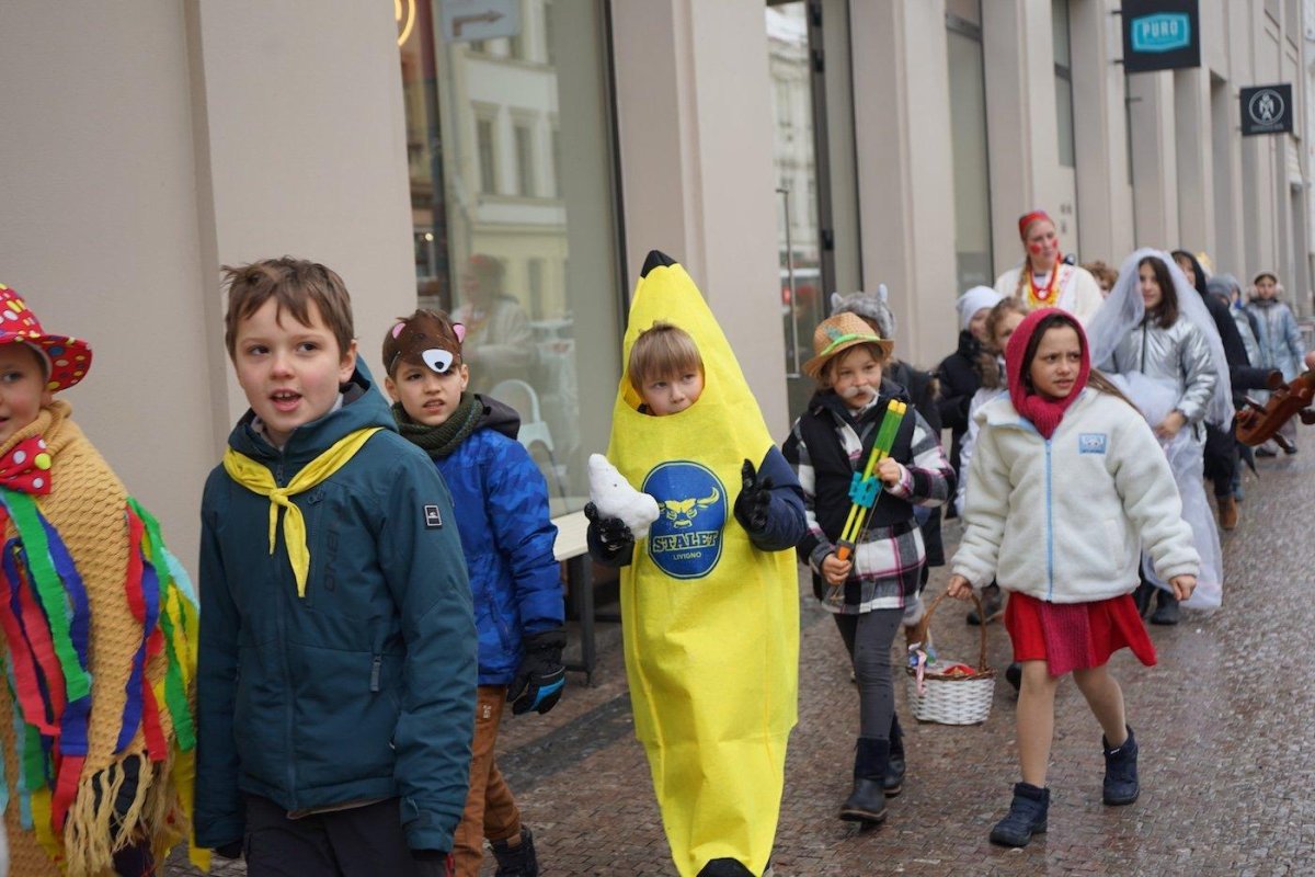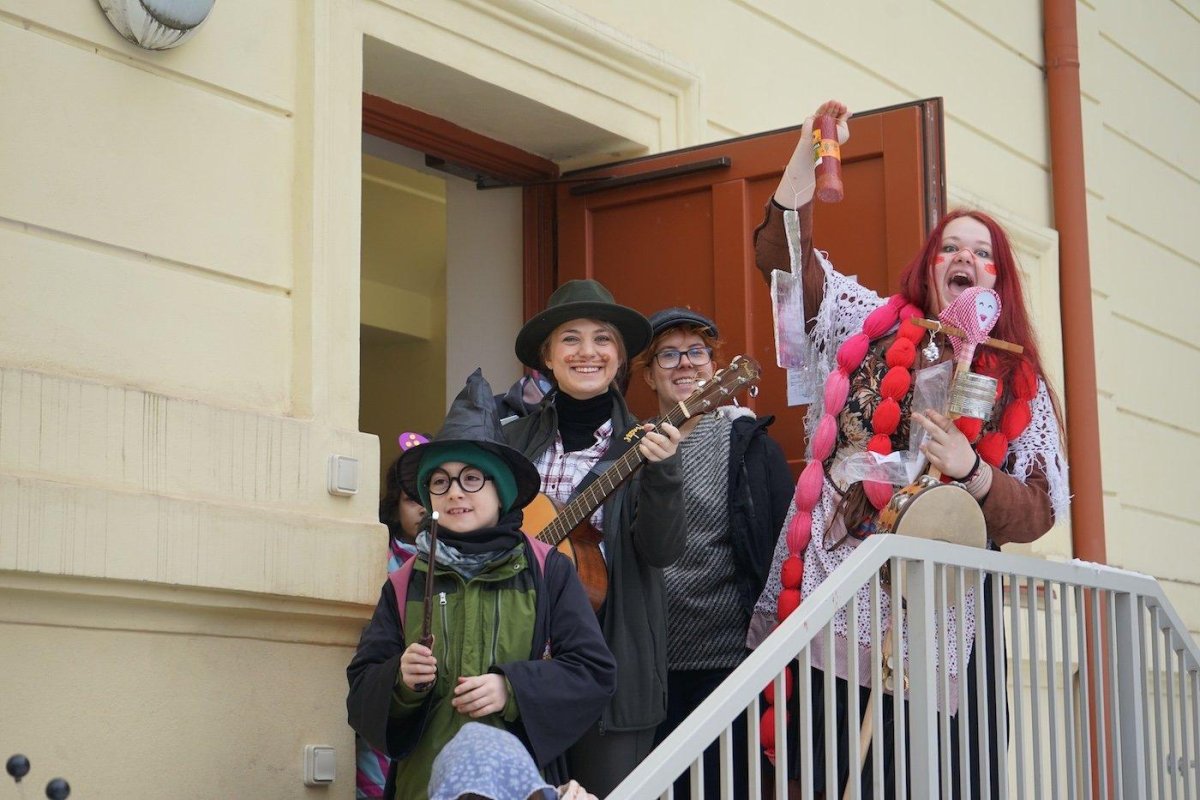 Pestrobarevný průvod masek vyrazil od budovy naší „Pernerky“ a doprovázen muzikanty probarvil zasněžené bílé ulice až k hlavní školní budově na Lyčkově náměstí. Radost byla nakažlivá – obyvatelé Karlína nám s úsměvem mávali a někteří se k veselému reji na chvíli i přidali.