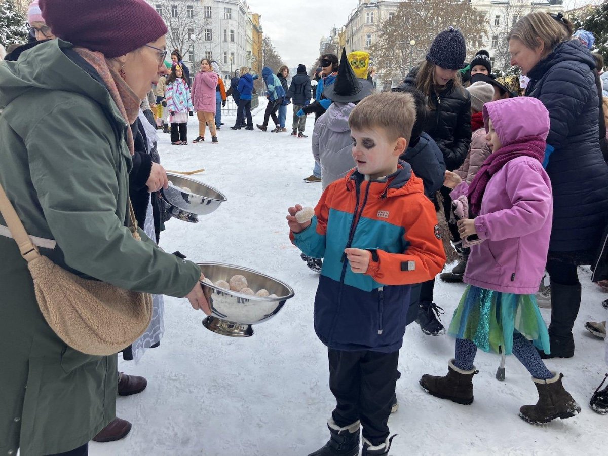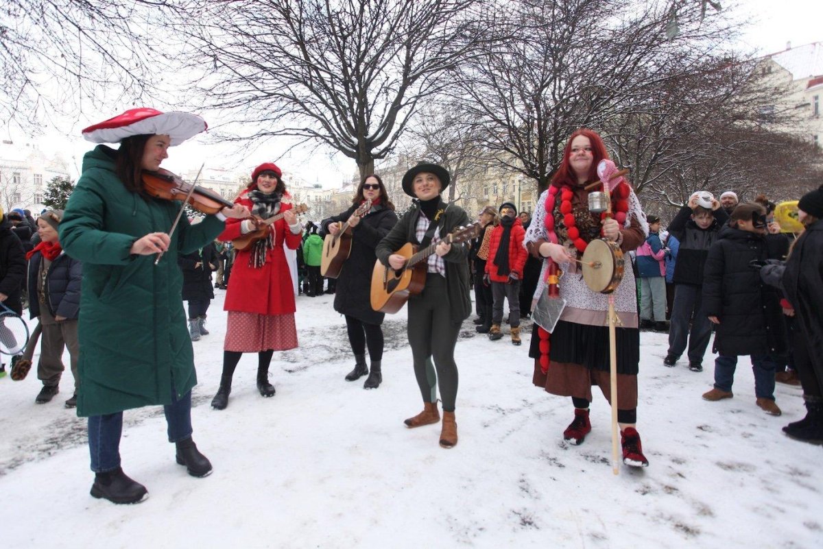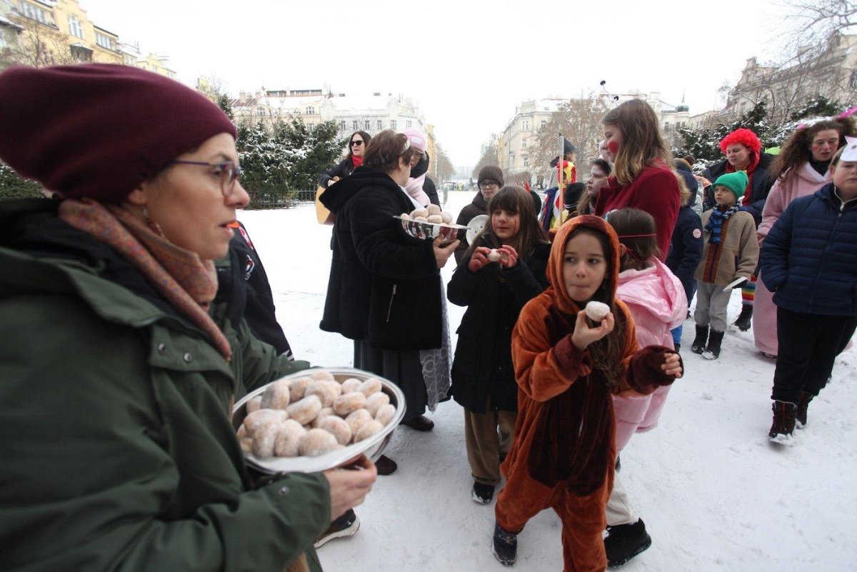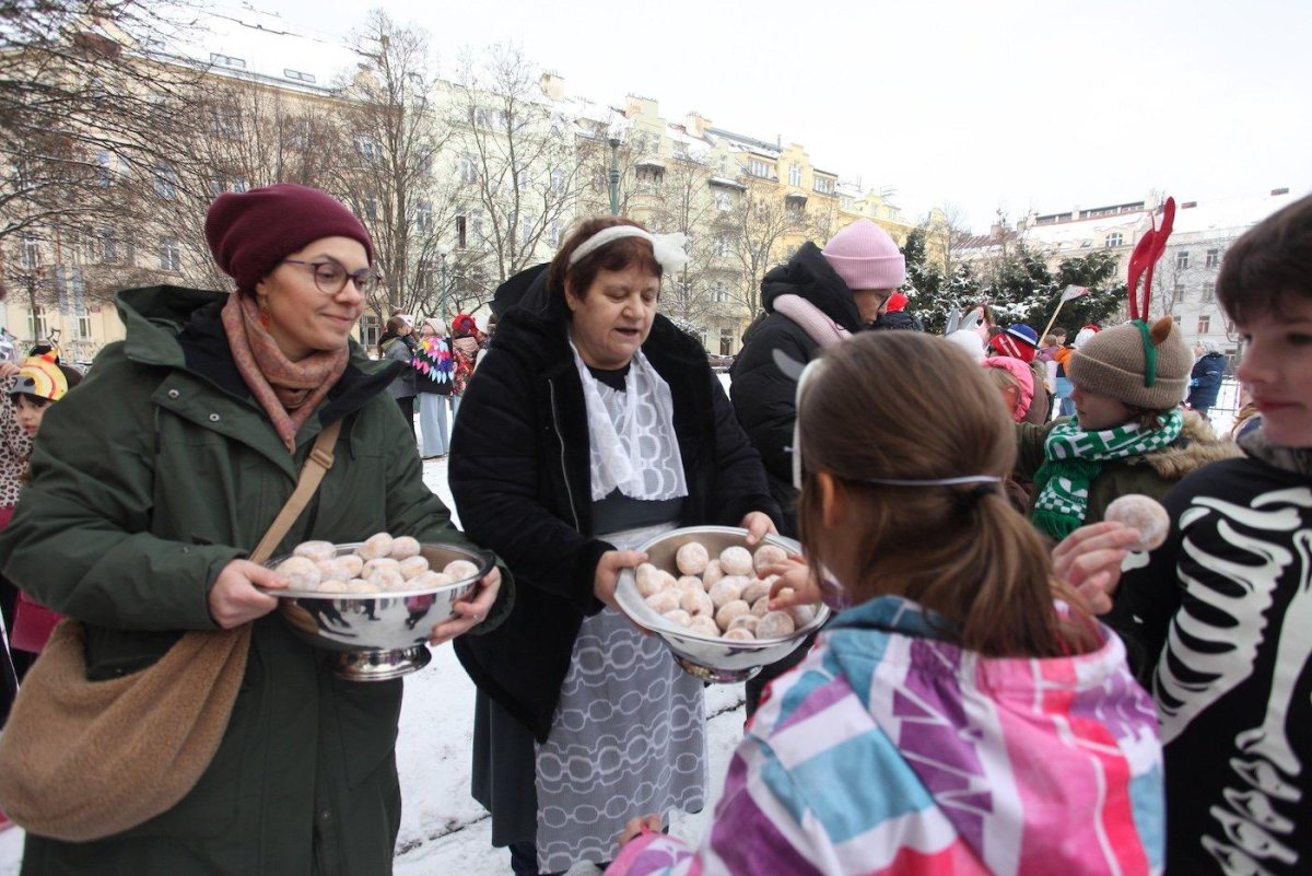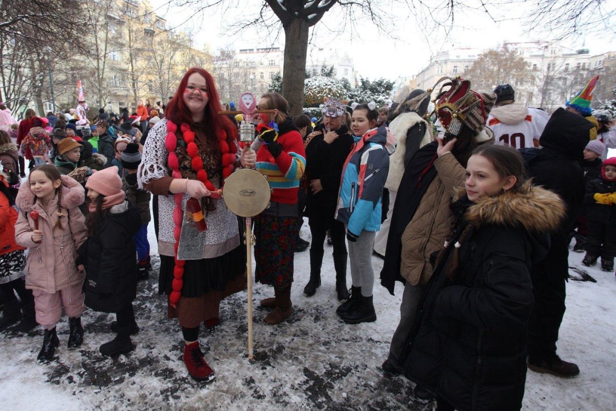 Zmrzlé nosy, hřejivá nálada a vůně koblih: Jak masopustní průvod rozehřál zasněžený Karlín