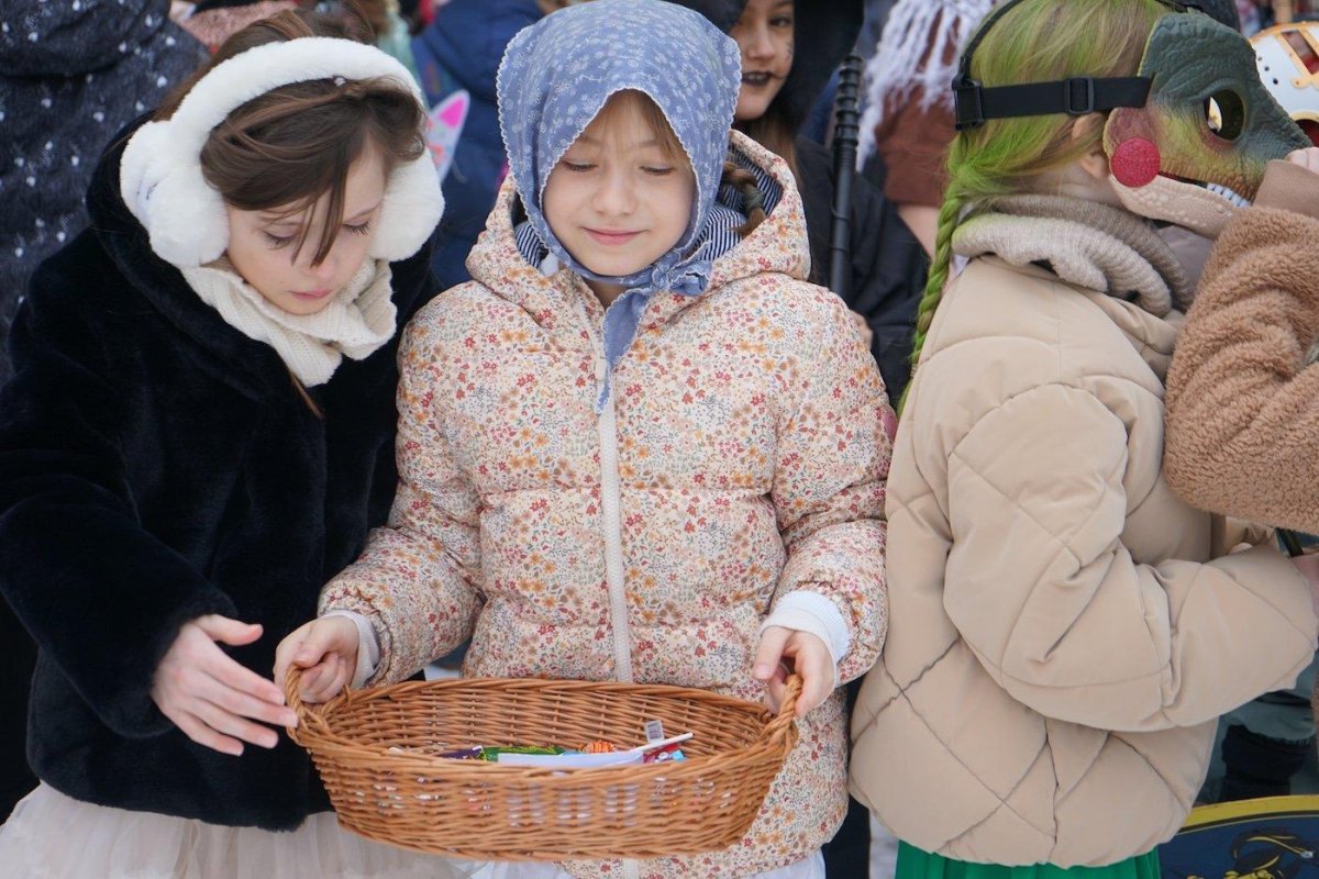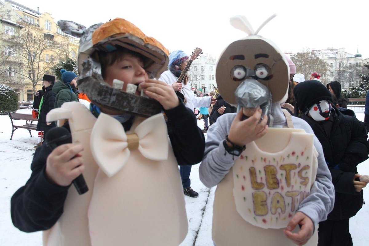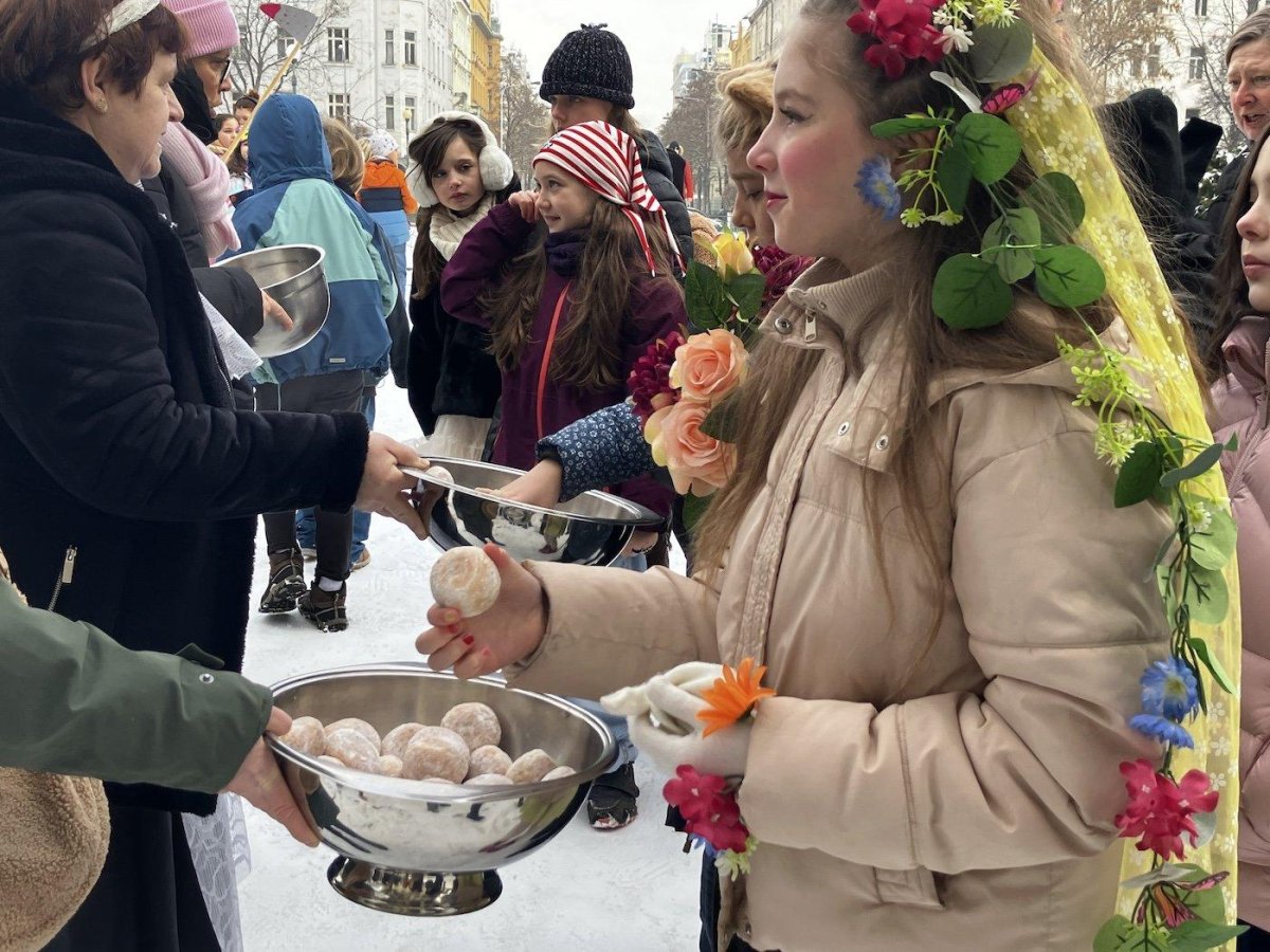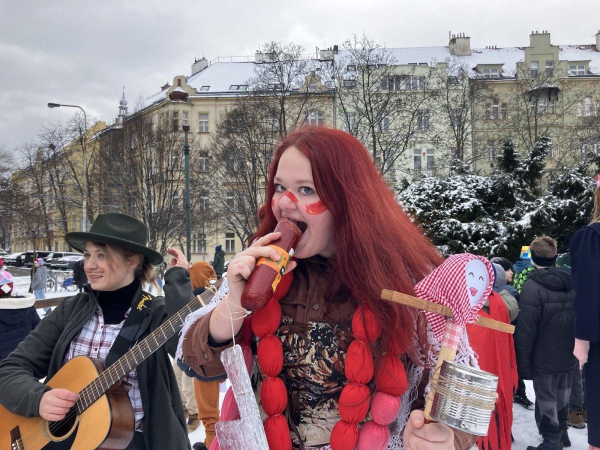 Zmrzlé nosy, hřejivá nálada a vůně koblih: Jak masopustní průvod rozehřál zasněžený Karlín