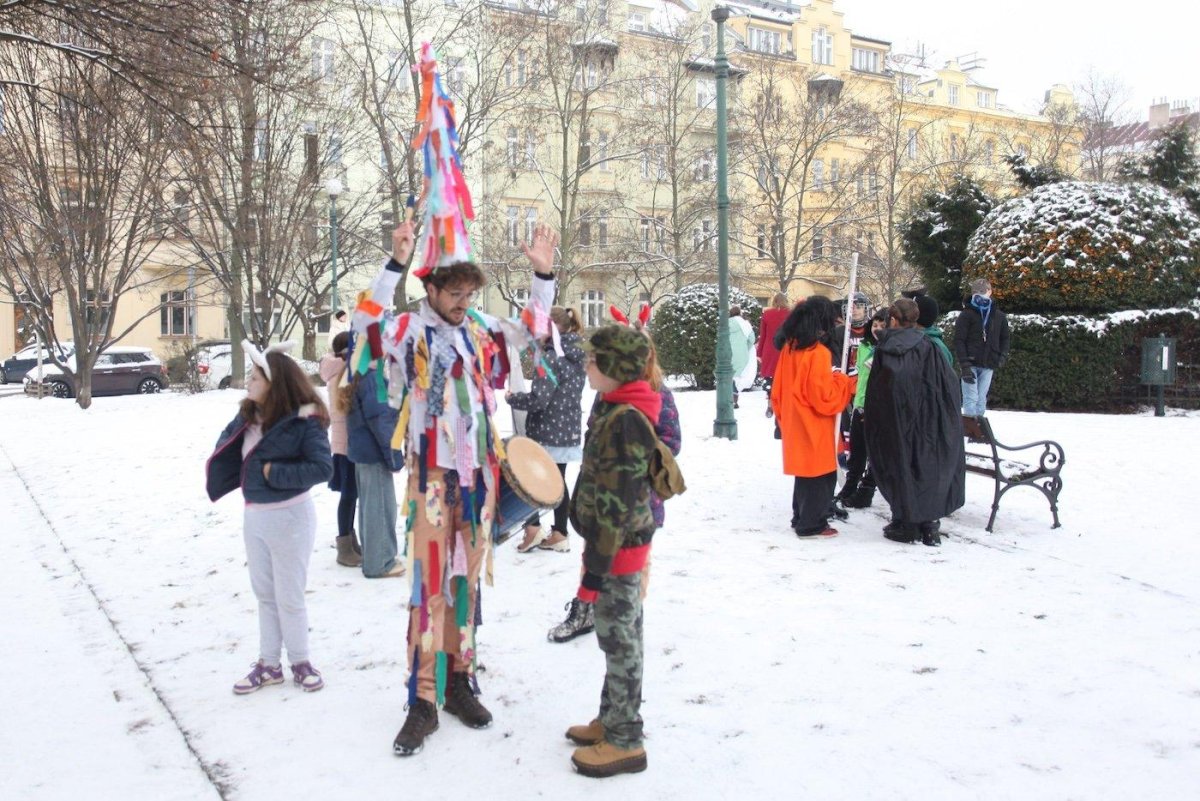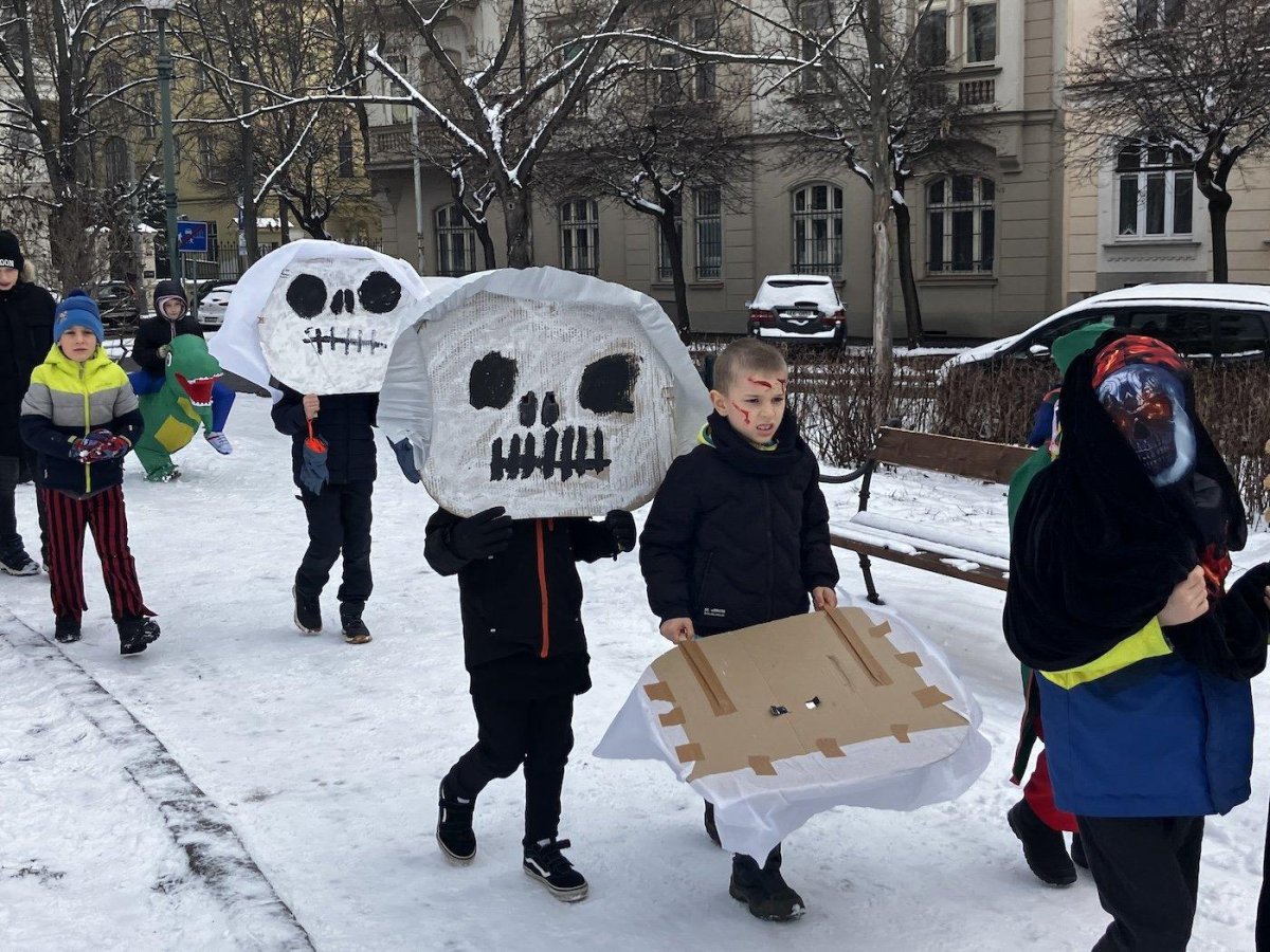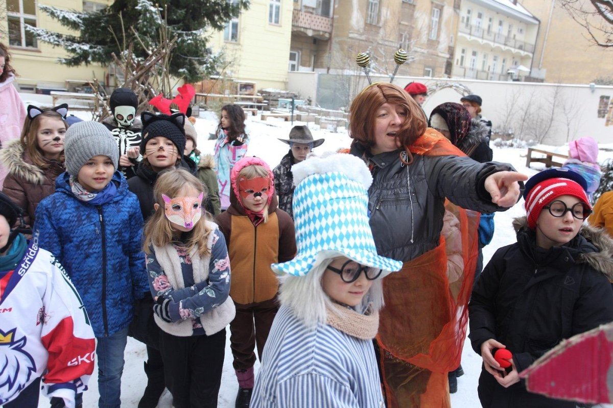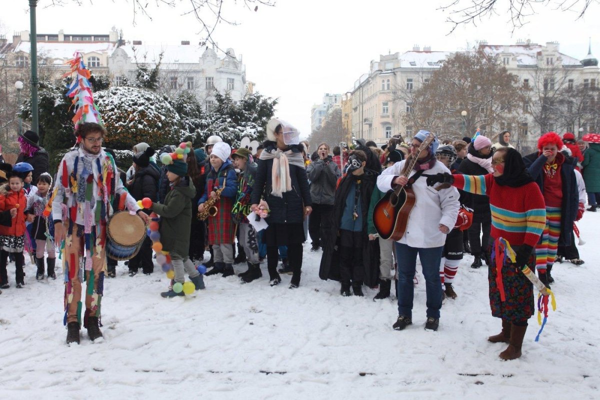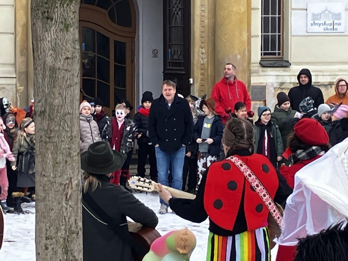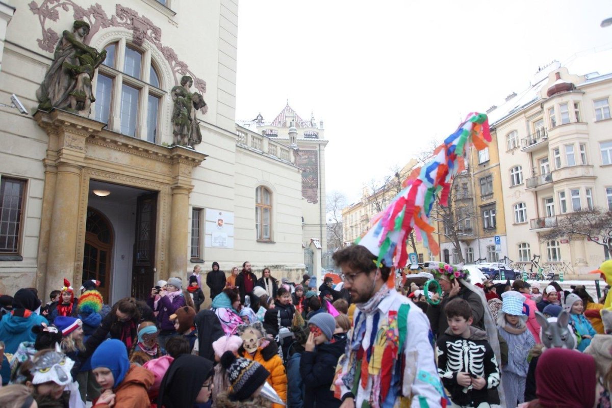 Bubnování a zpěv se mísily s dětským smíchem, a i když rtuť teploměru klesla pod nulu, při tanci a pohybu se všichni bleskově zahřáli. Na Lyčkově náměstí nás přivítal ředitel naší školy Jan Korda, který ve svém krátkém proslovu popřál všem krásný masopust a poděkoval za to, že se potkáváme v tak hojném počtu.