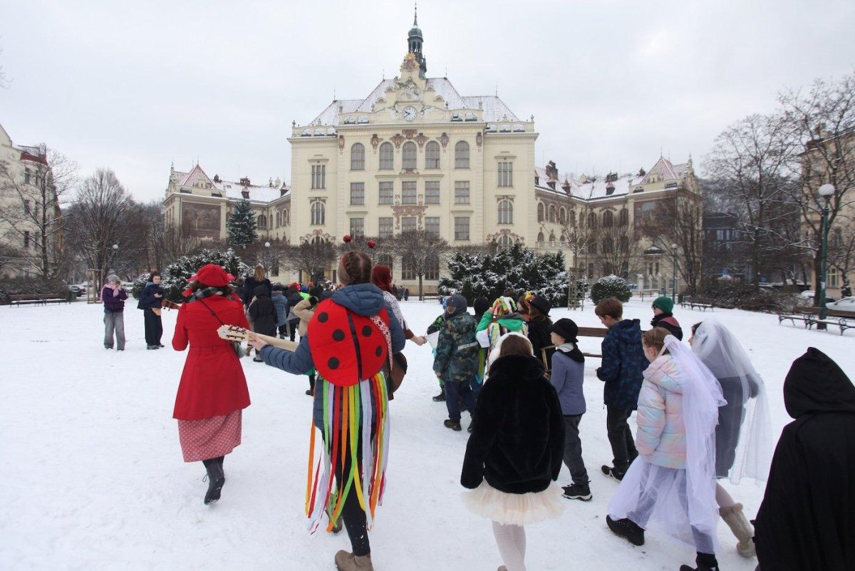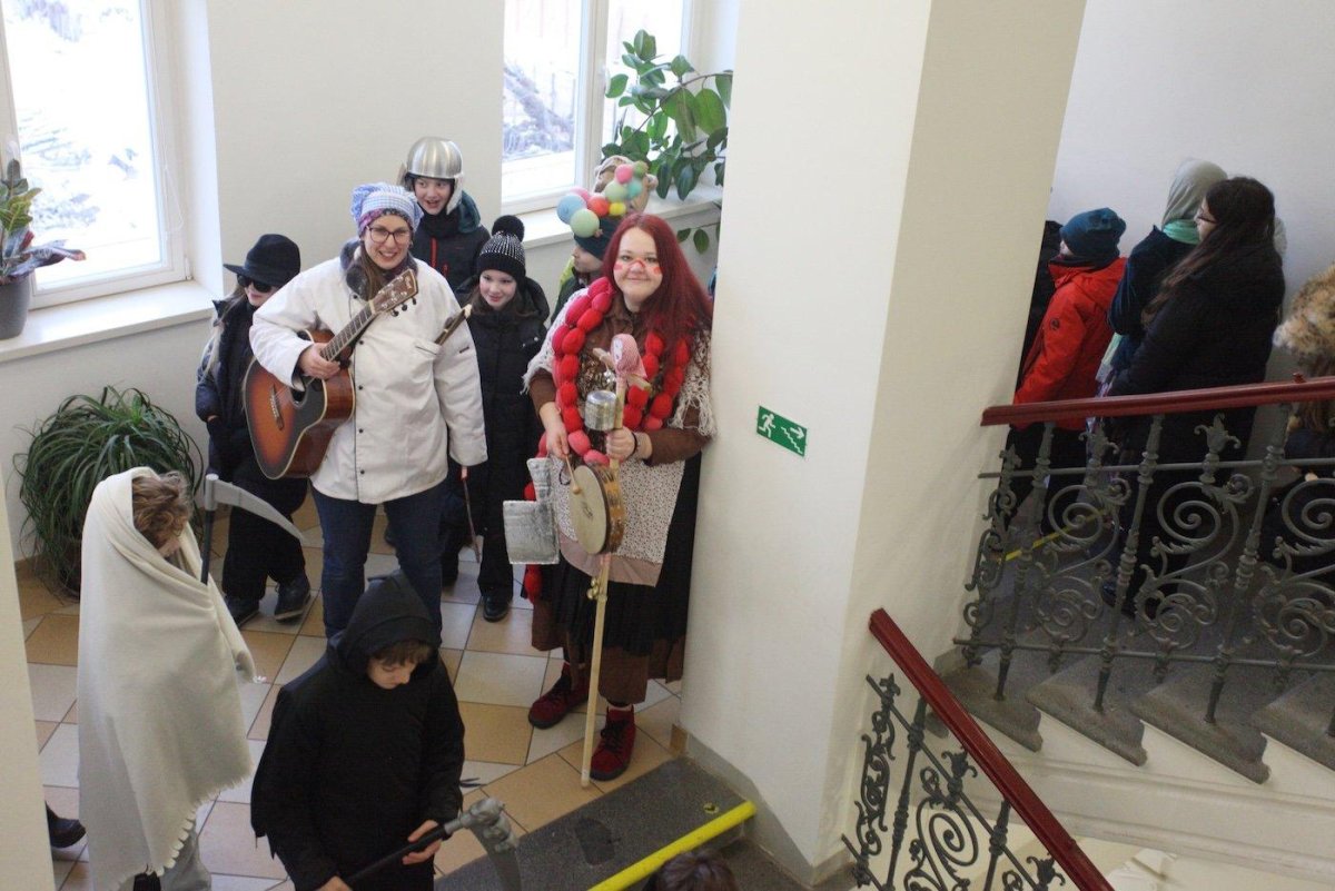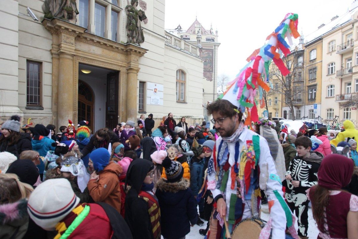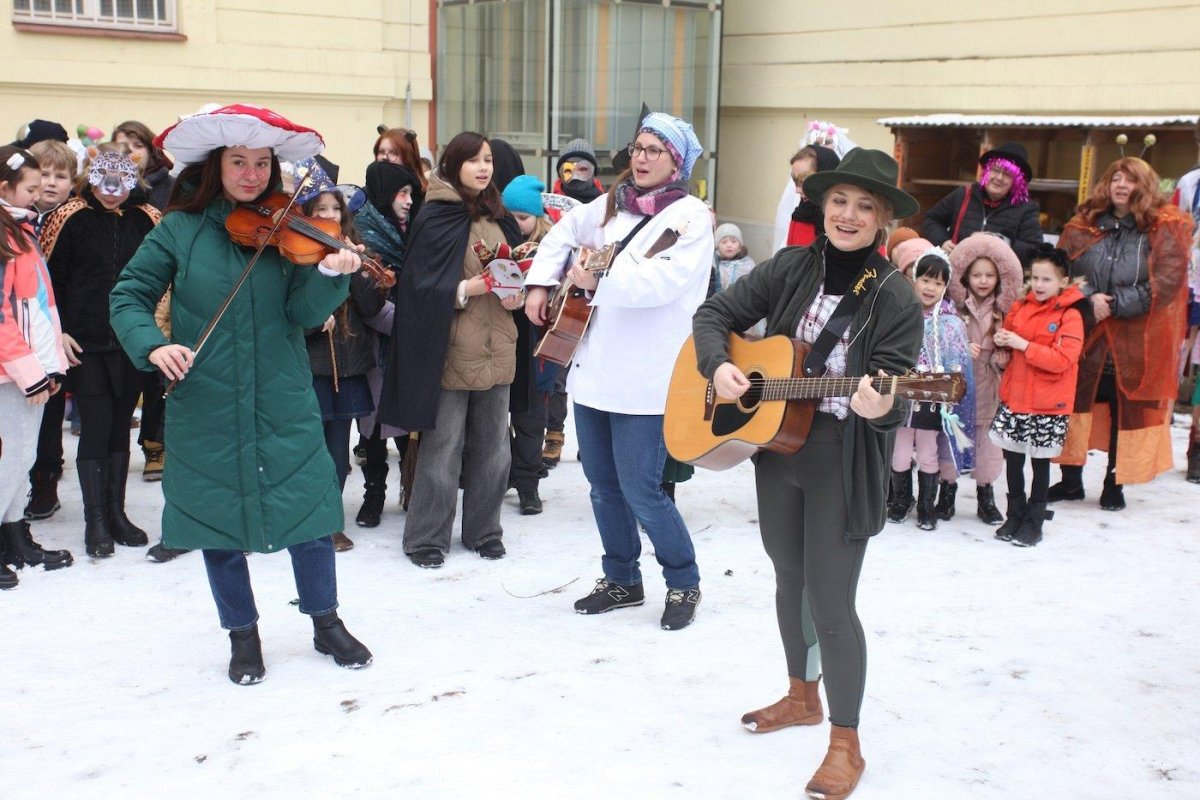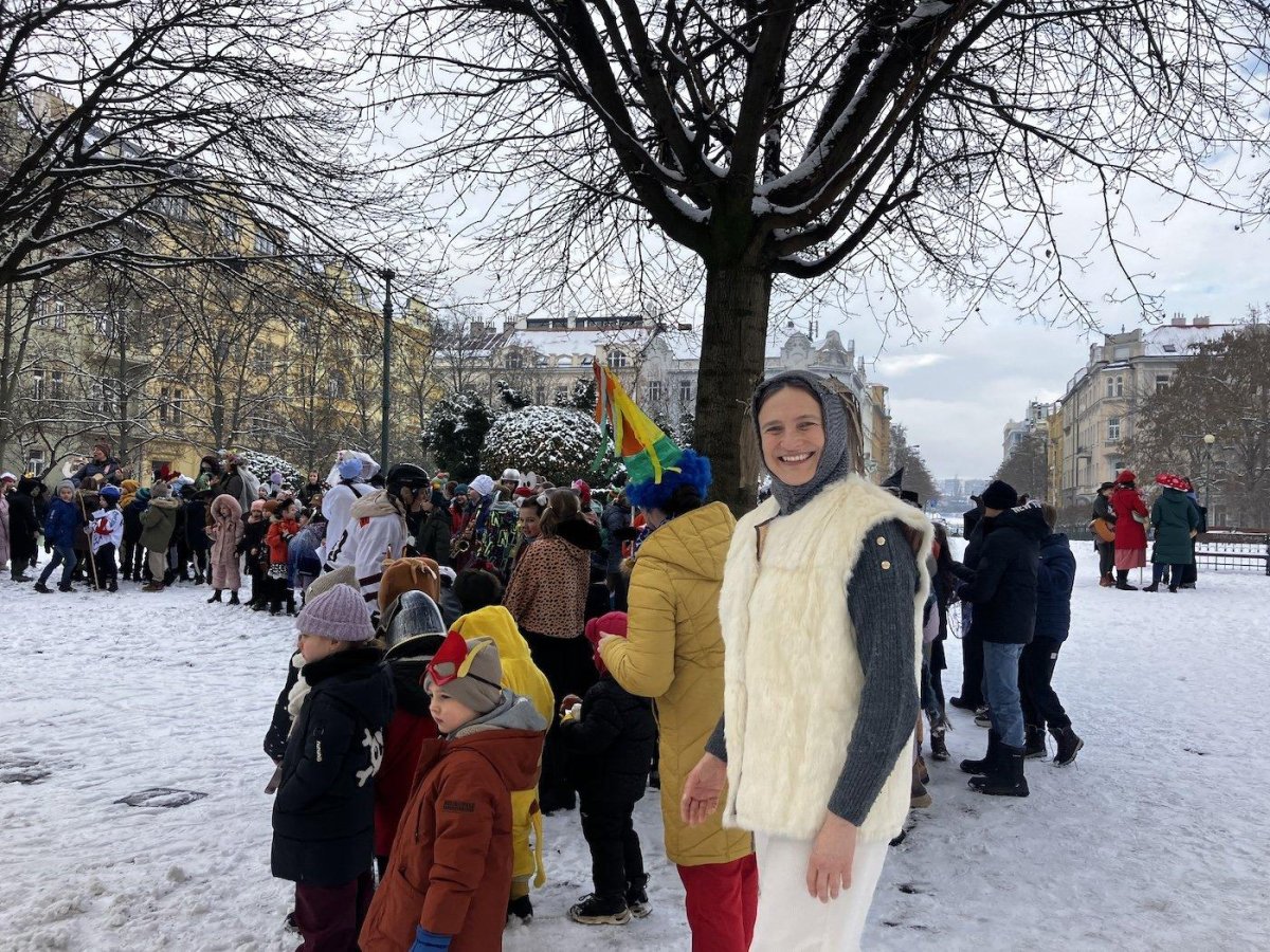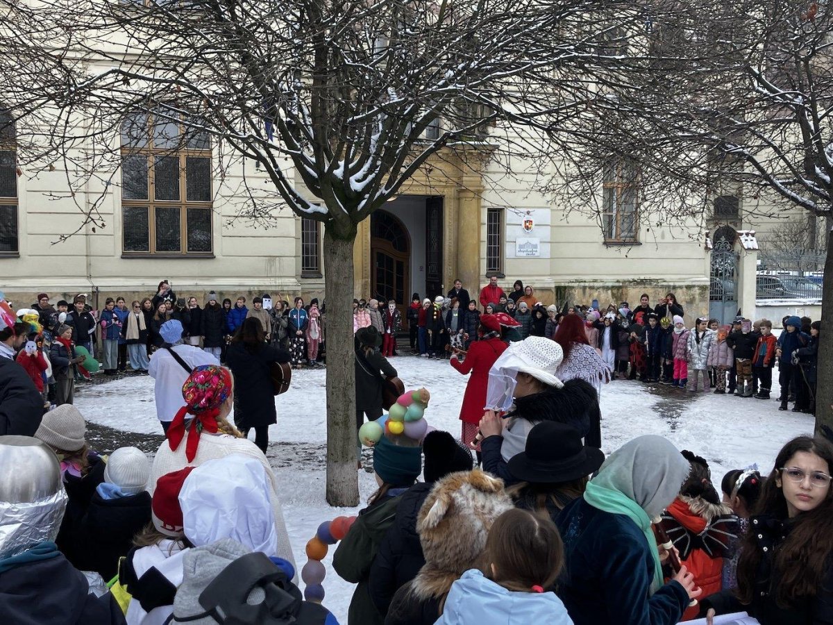Bubnování a zpěv se mísily s dětským smíchem, a i když rtuť teploměru klesla pod nulu, při tanci a pohybu se všichni bleskově zahřáli. Na Lyčkově náměstí nás přivítal ředitel naší školy Jan Korda, který ve svém krátkém proslovu popřál všem krásný masopust a poděkoval za to, že se potkáváme v tak hojném počtu.