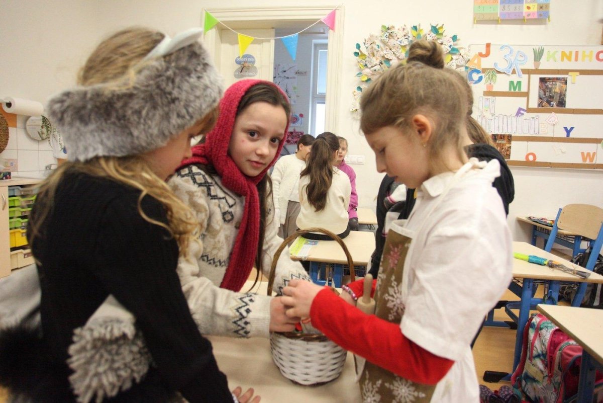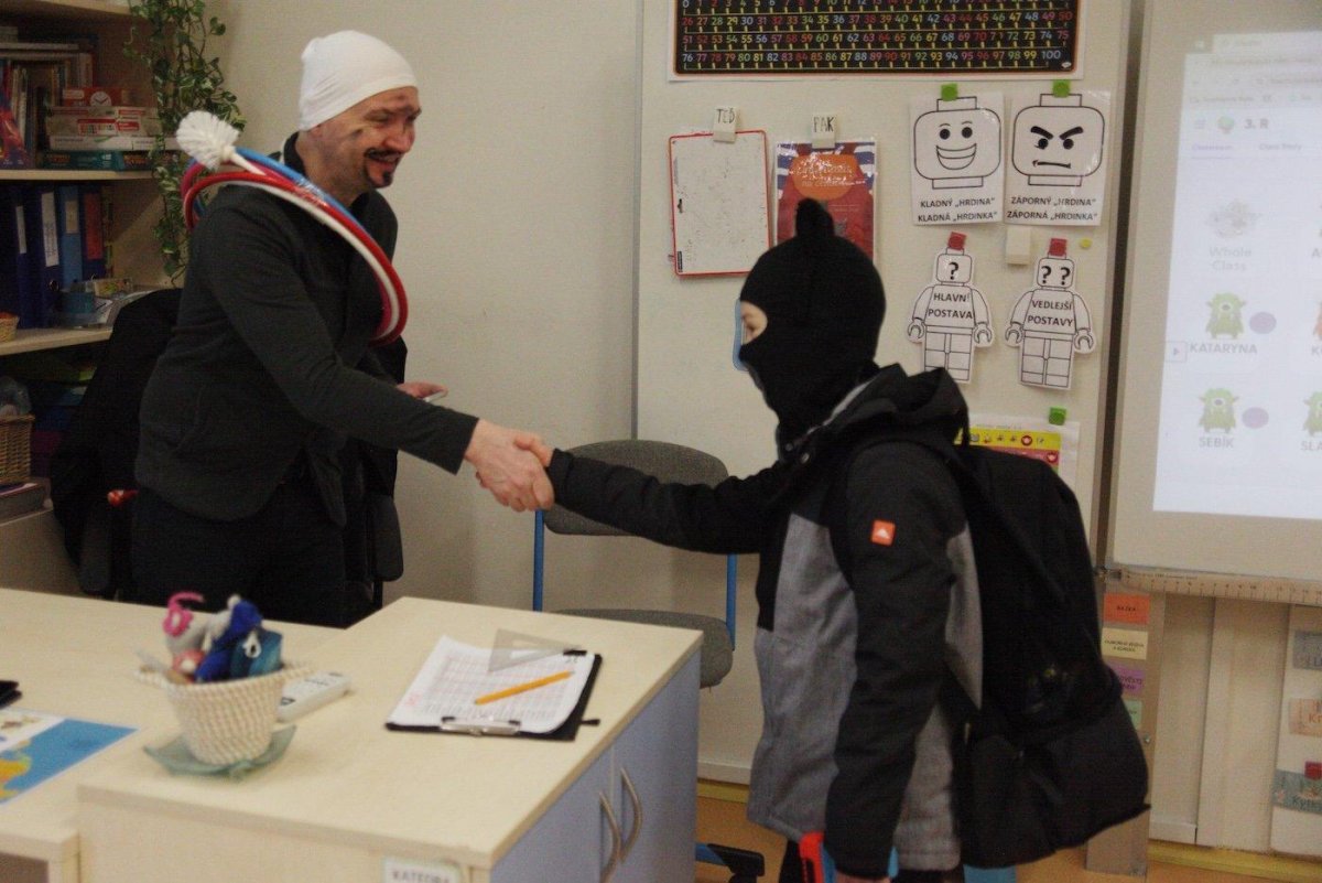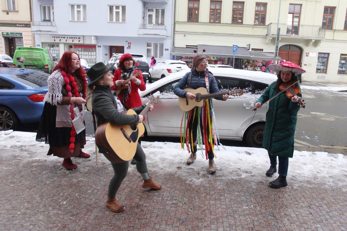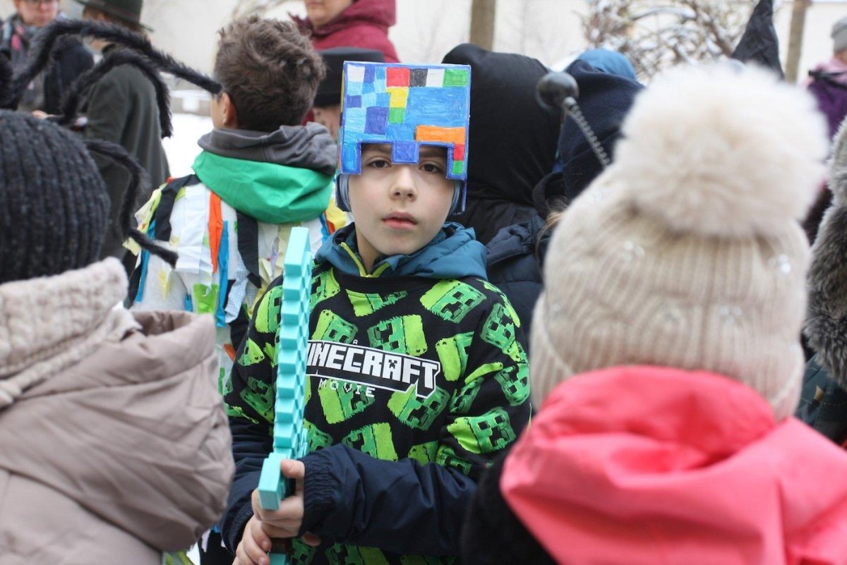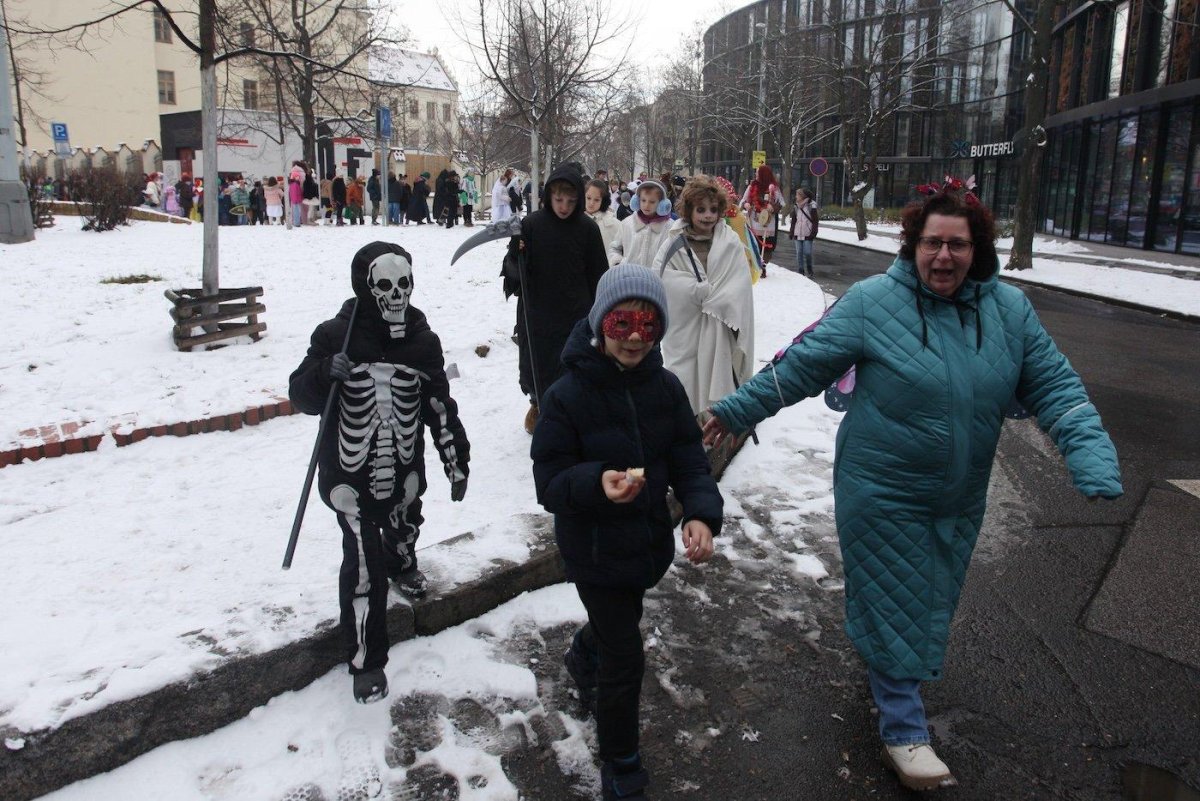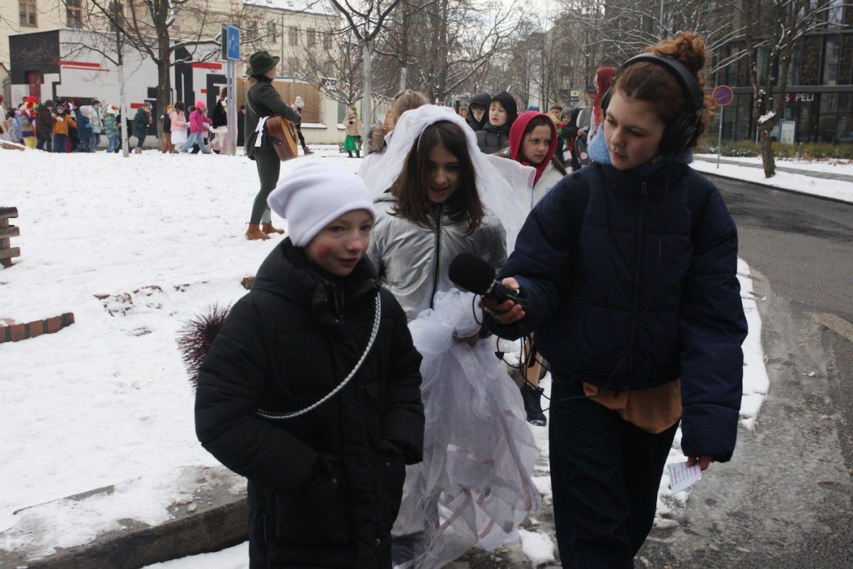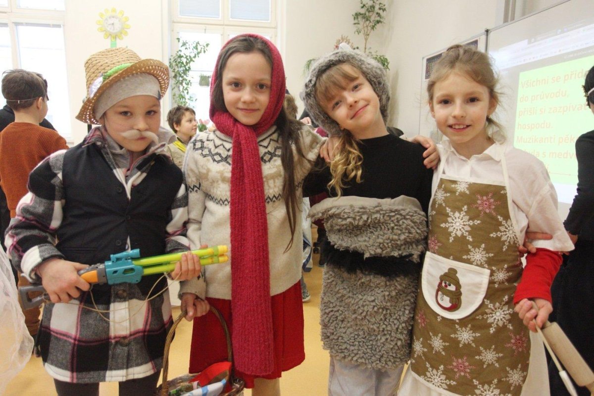Bubnování a zpěv se mísily s dětským smíchem, a i když rtuť teploměru klesla pod nulu, při tanci a pohybu se všichni bleskově zahřáli. Na Lyčkově náměstí nás přivítal ředitel naší školy Jan Korda, který ve svém krátkém proslovu popřál všem krásný masopust a poděkoval za to, že se potkáváme v tak hojném počtu.