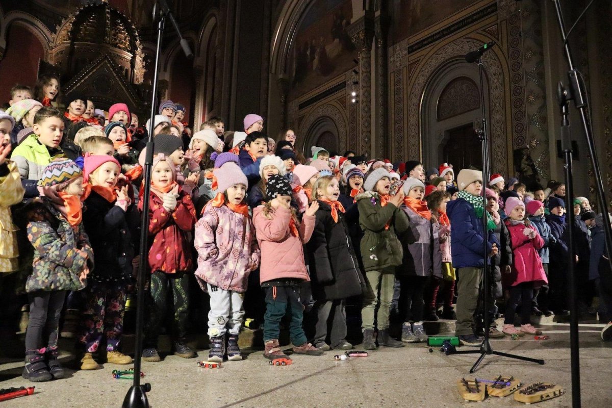 Na koncertě zazpívaly děti z dvanácti tříd prvního stupně naší školy a děti ze školního sboru Piánko, kteří doprovodily písně na rytmické a melodické nástroje. Kostelem se rozezněly tóny vánočních koled.
