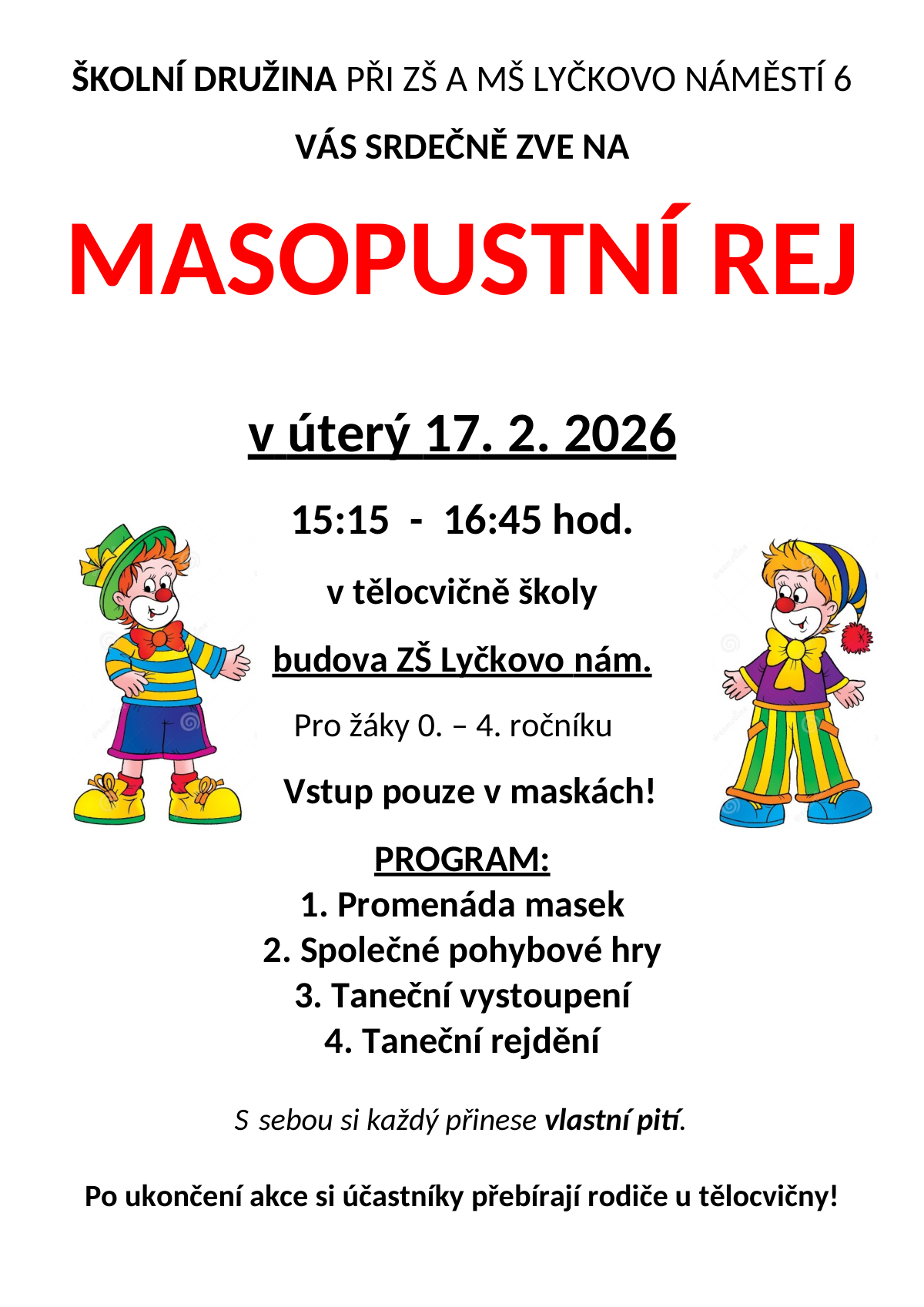 Školní družina na Lyčkově náměstí zve na masopustní rej 17. února od 15:15 do 16:45 v tělocvičně školy.
