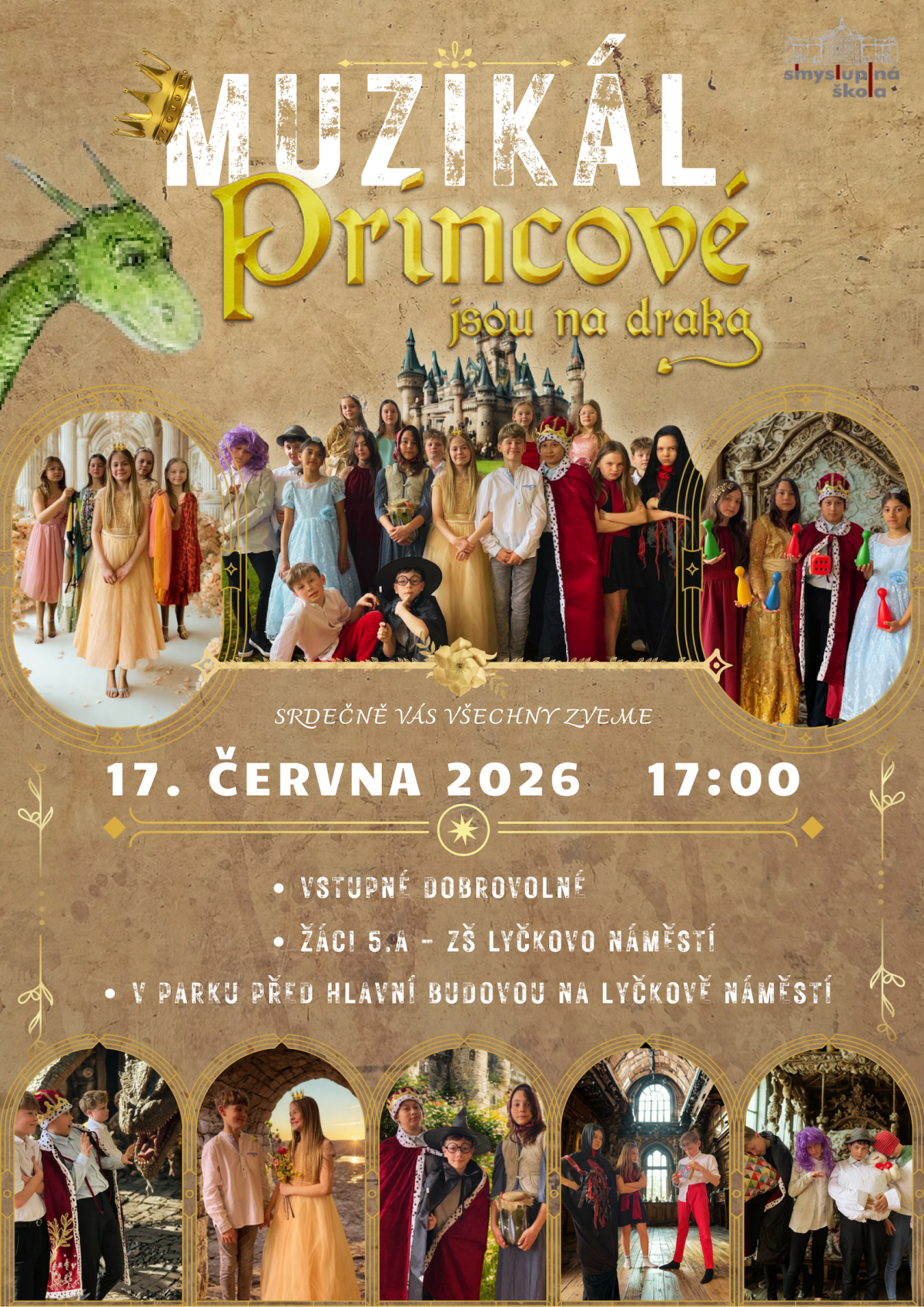Zveme Vás na připravované muzikálové představení žáků třídy 5.A. Představení se uskuteční dne 17. června 2026 v parku před budovou školy na Lyčkově náměstí. Pro učitele, rodiče a veřejnost budeme hrát od 17:00.